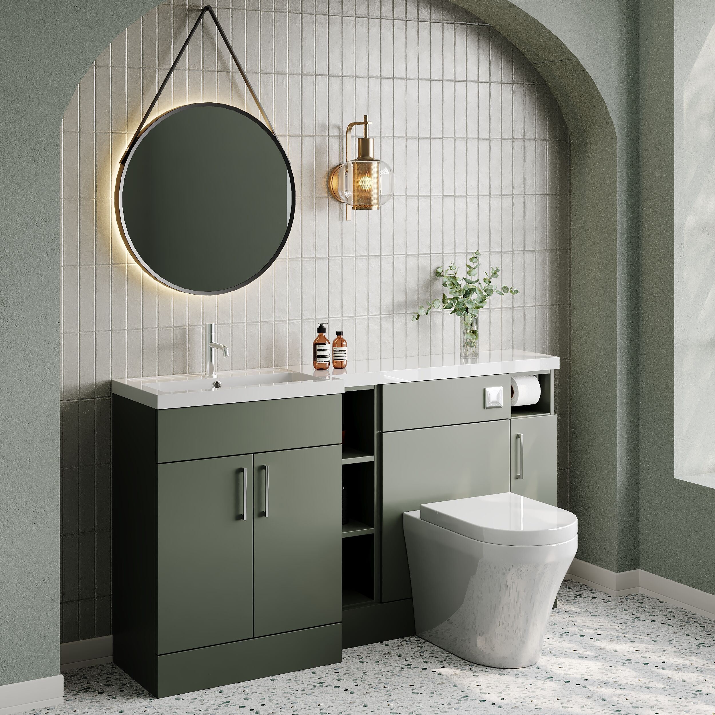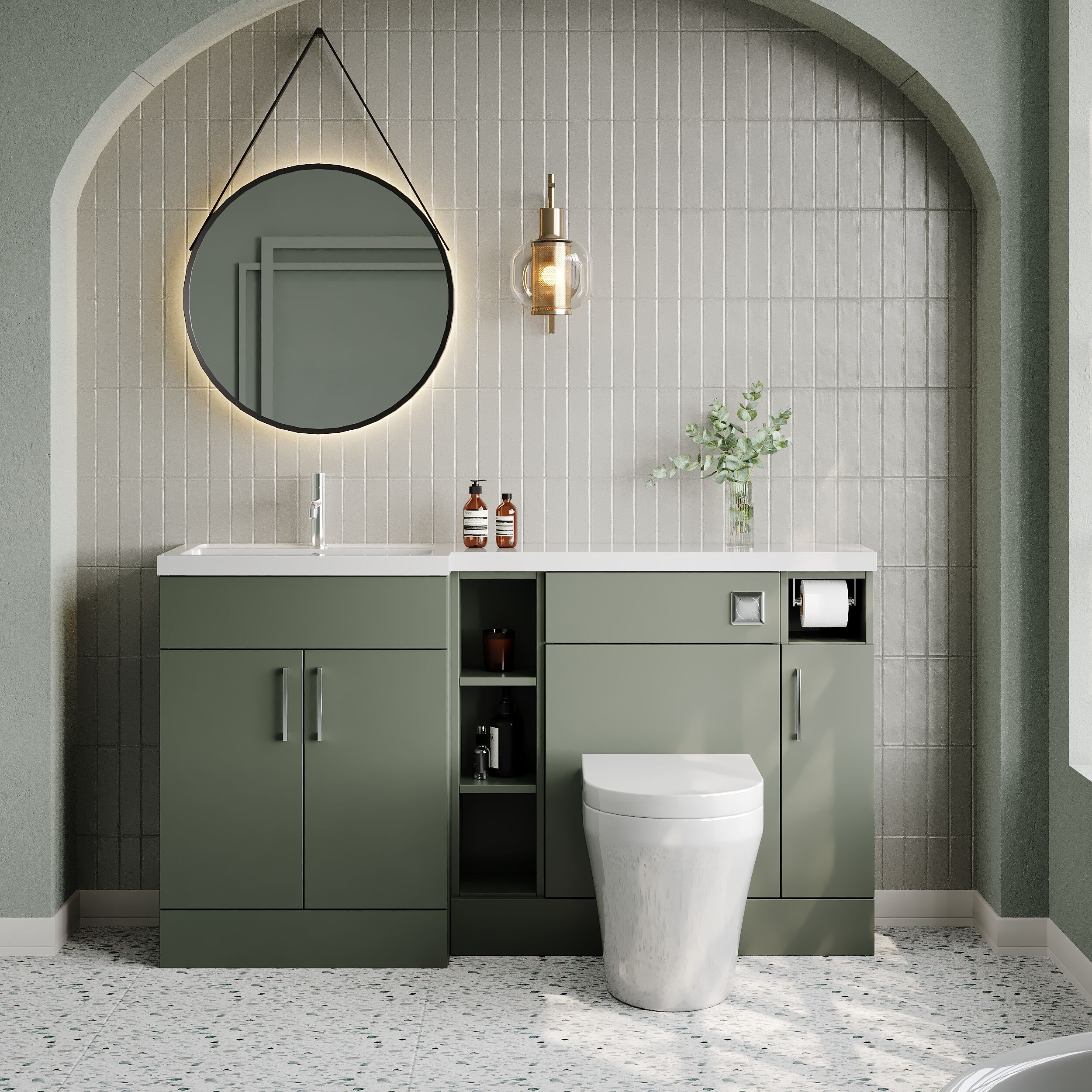 Nuie Lux Krest 1500mm Fern Green Left Hand Combination Unit & L-Shaped Basin With Soft Close Doors
