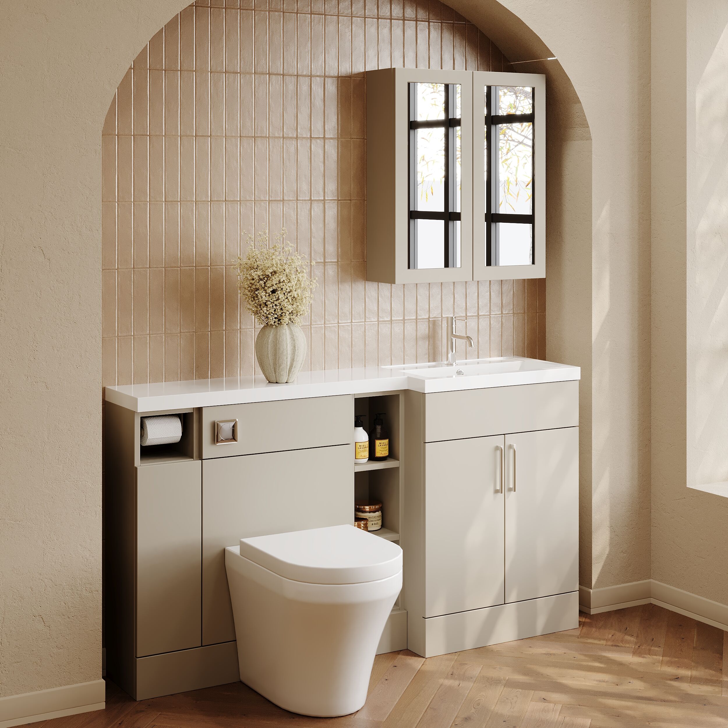 Nuie Lux Krest 1500mm Pebble Grey Contemporary Combination Unit & L-Shaped Basin Right Hand