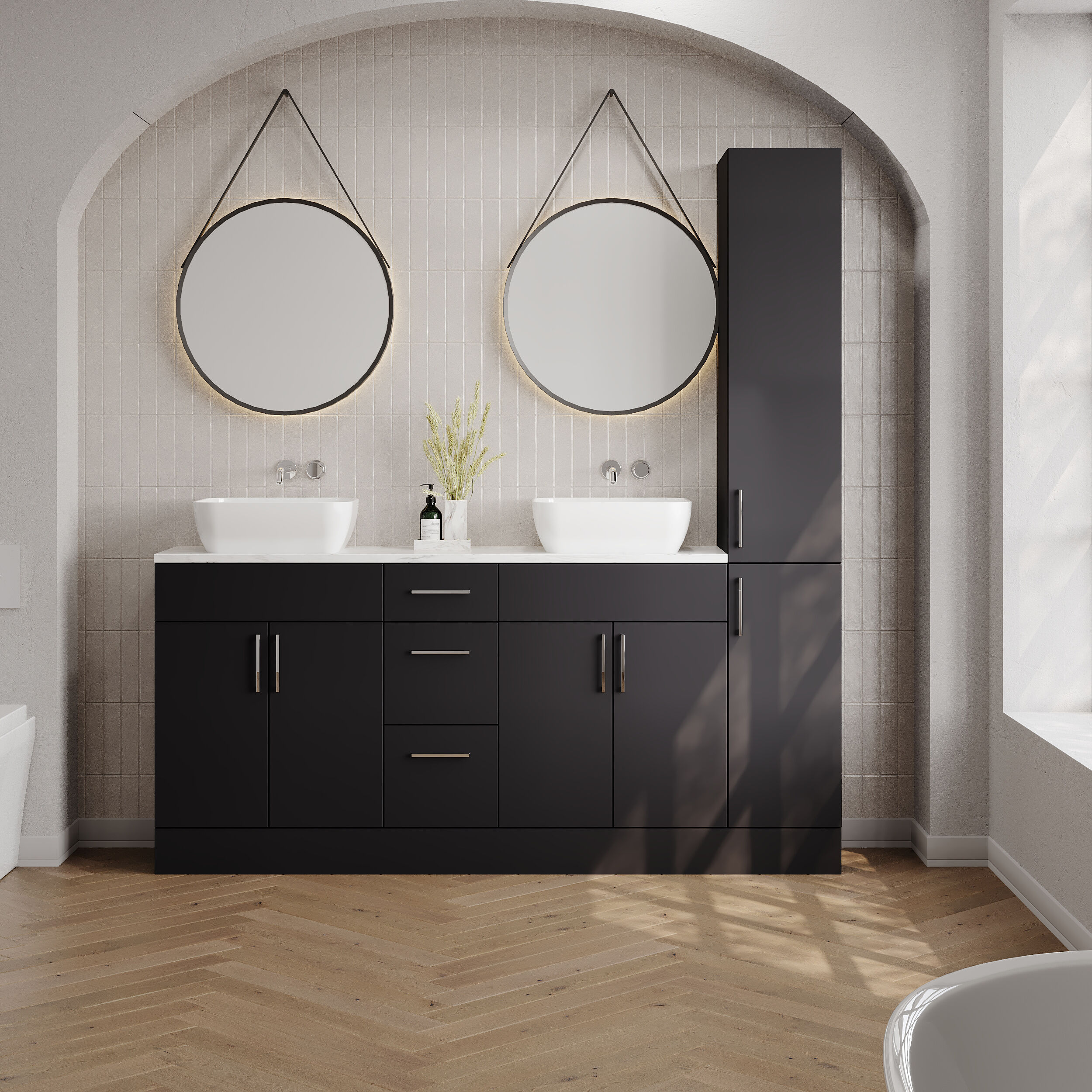 All furniture is supplied rigid for easy installation and features soft-close doors and drawers throughout