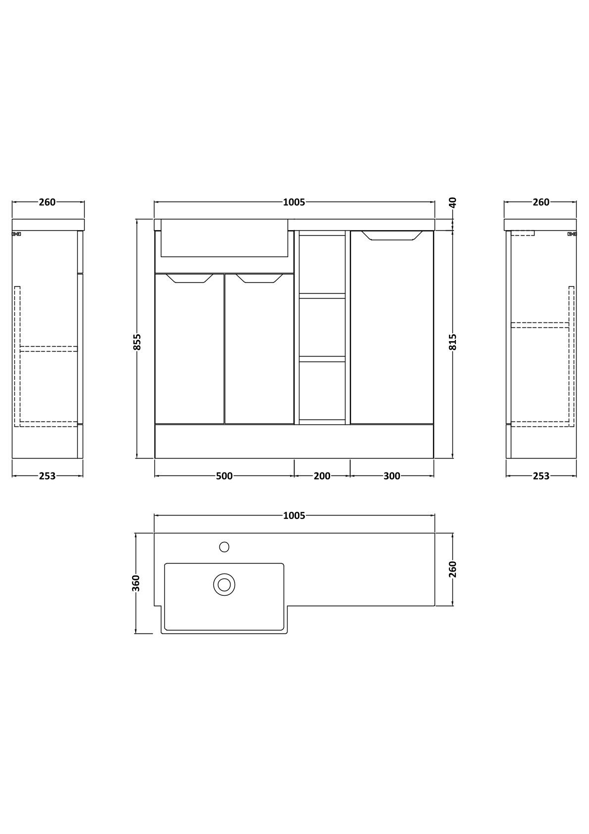 Supplied with luxury polymarble left-hand basin, predrilled with 1 tap hole.