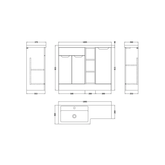 Supplied with luxury polymarble left-hand basin, predrilled with 1 tap hole.