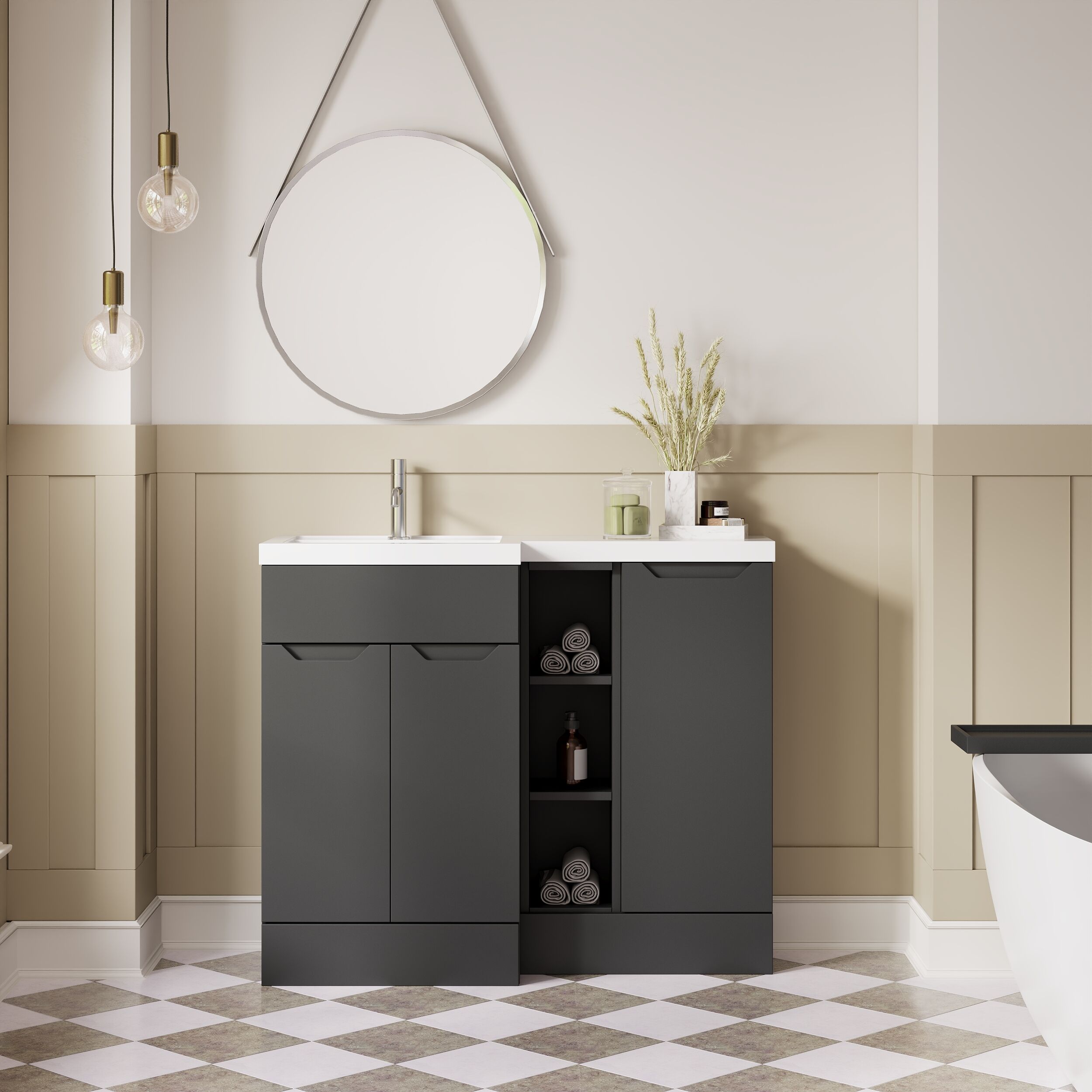 Supplied with luxury polymarble left-hand basin, predrilled with 1 tap hole.