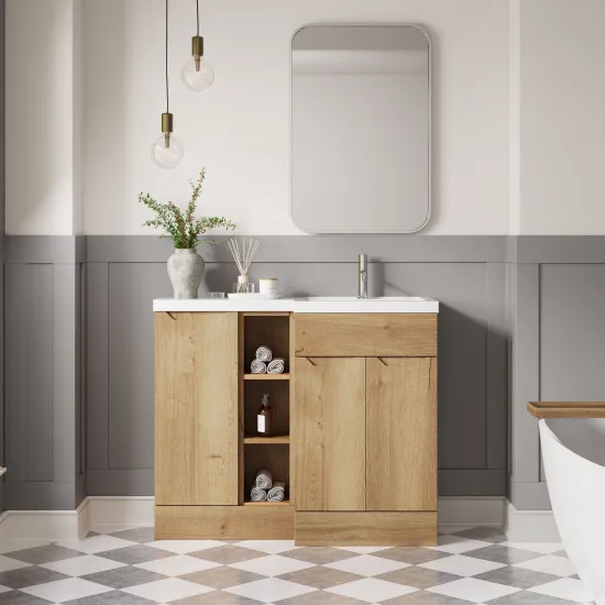 Nuie Lux Loave 1000mm Autumn Oak Right Hand Combination Unit & L-Shaped Basin with Soft Close Doors