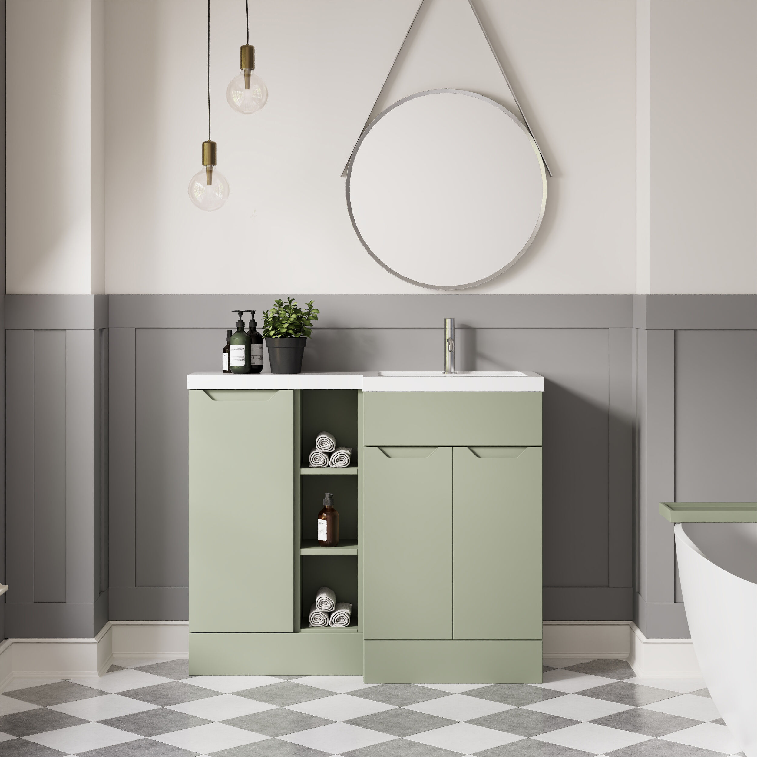 Nuie Lux Loave 1000mm Reed Green Right Hand Handleless Combination Unit & L-Shaped Basin