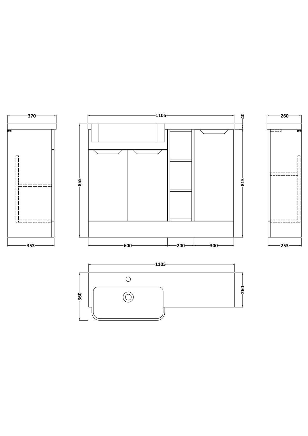 Supplied with luxury polymarble left-hand basin, predrilled with 1 tap hole.