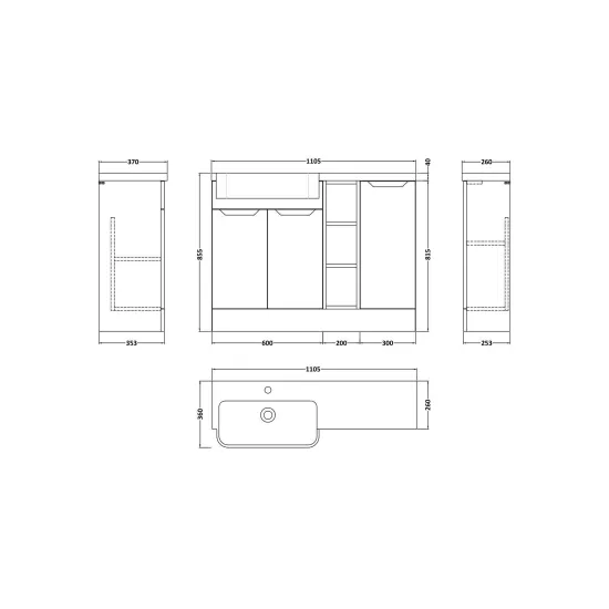 Supplied with luxury polymarble left-hand basin, predrilled with 1 tap hole.