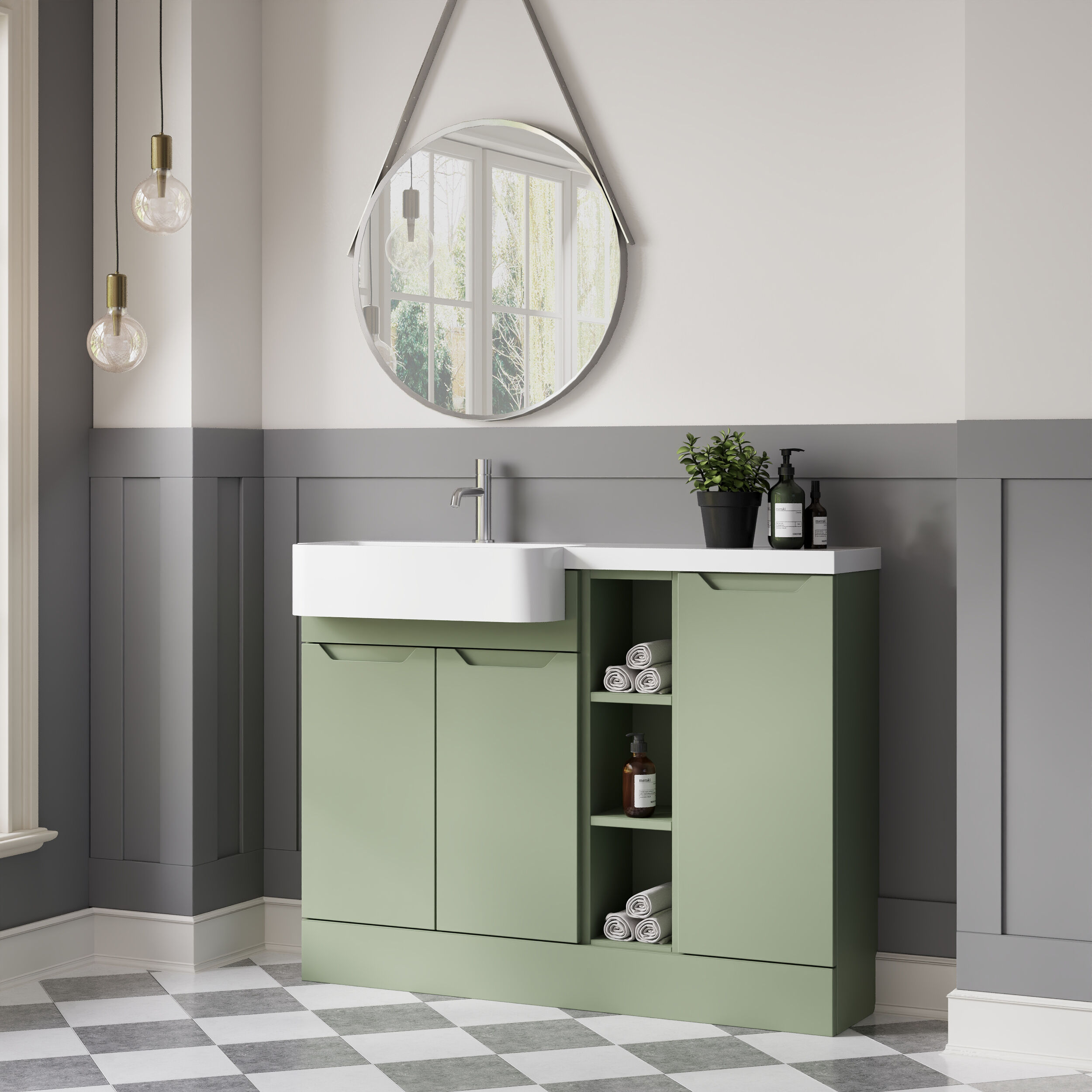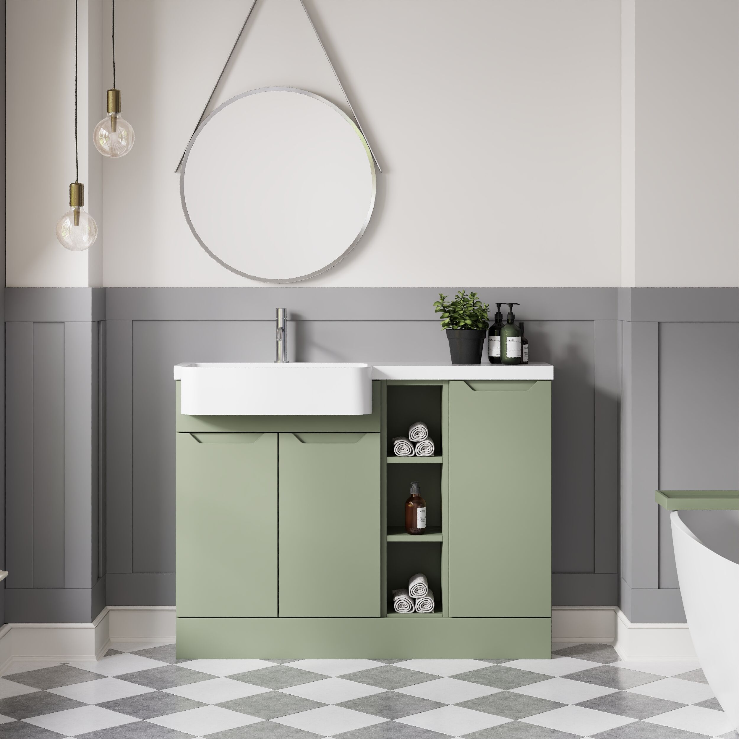 Nuie Lux Loave 1100mm Reed Green Left Hand Combination Unit & Basin With Soft Close Doors & Drawers