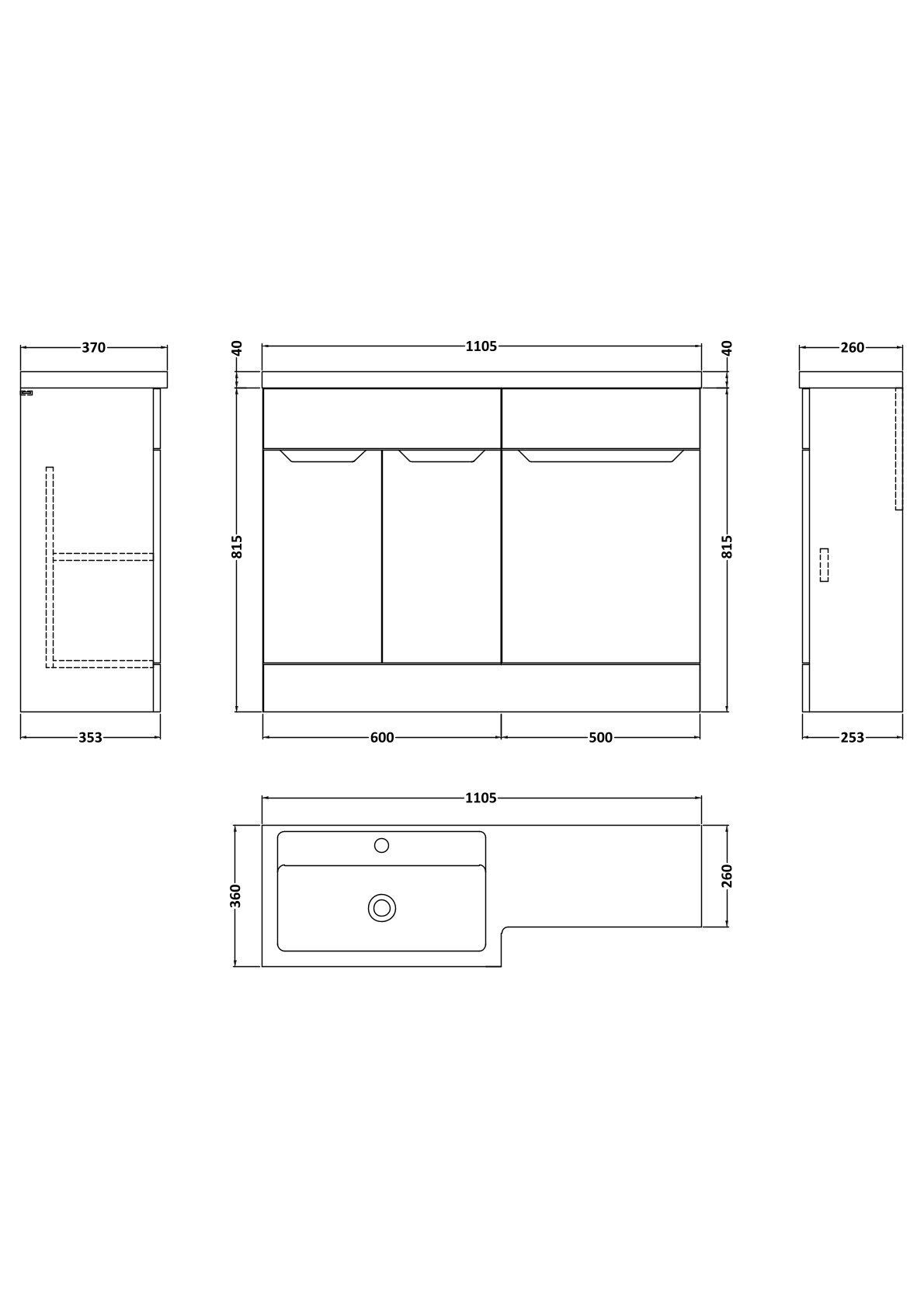 Supplied with luxury polymarble left-hand basin, predrilled with 1 tap hole.