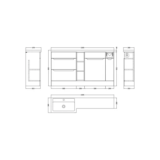 Supplied with luxury polymarble left-hand basin, predrilled with 1 tap hole.