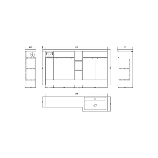 Supplied with luxury polymarble right-hand basin, predrilled with 1 tap hole.