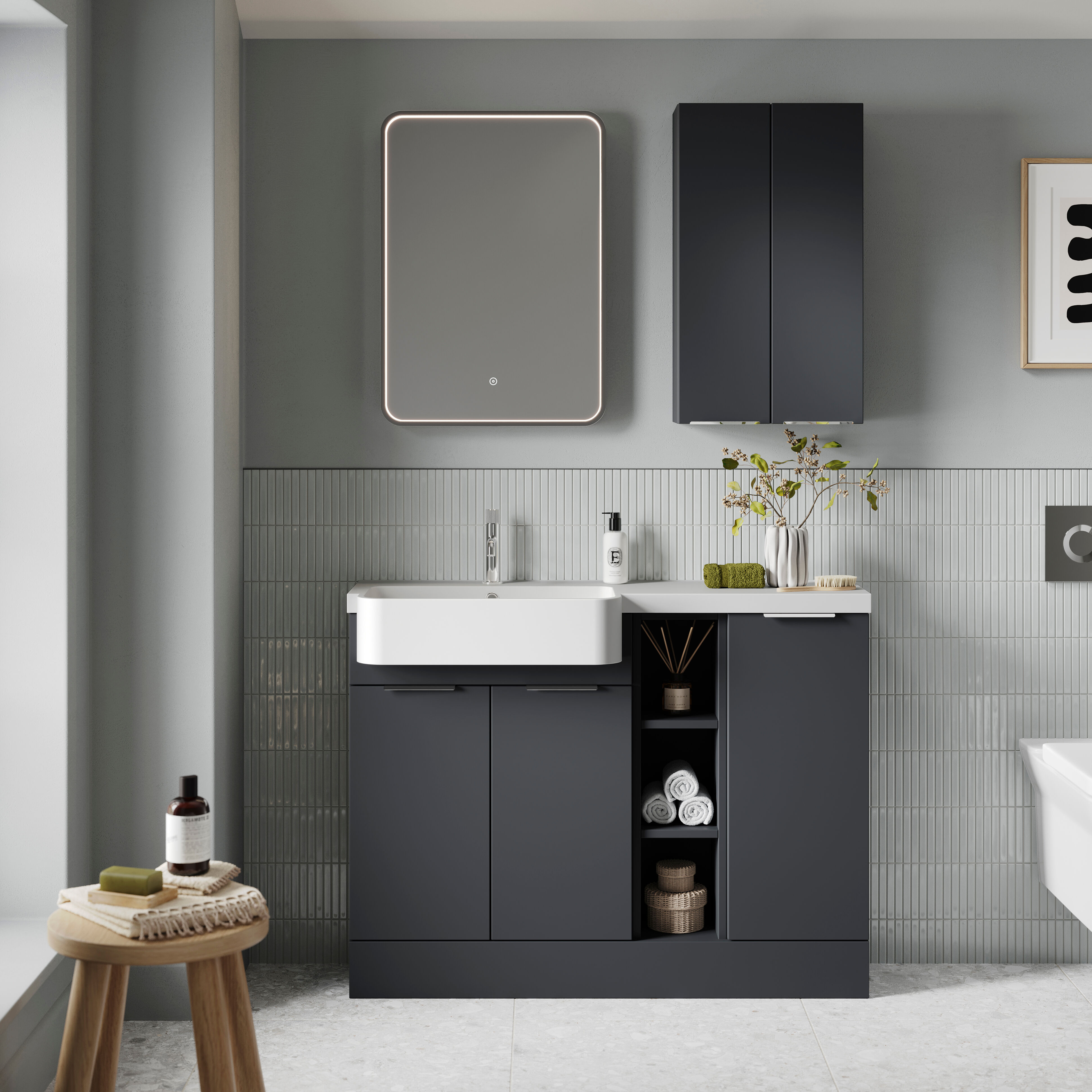 All furniture is supplied rigid for easy installation and features soft-close doors and drawers throughout.