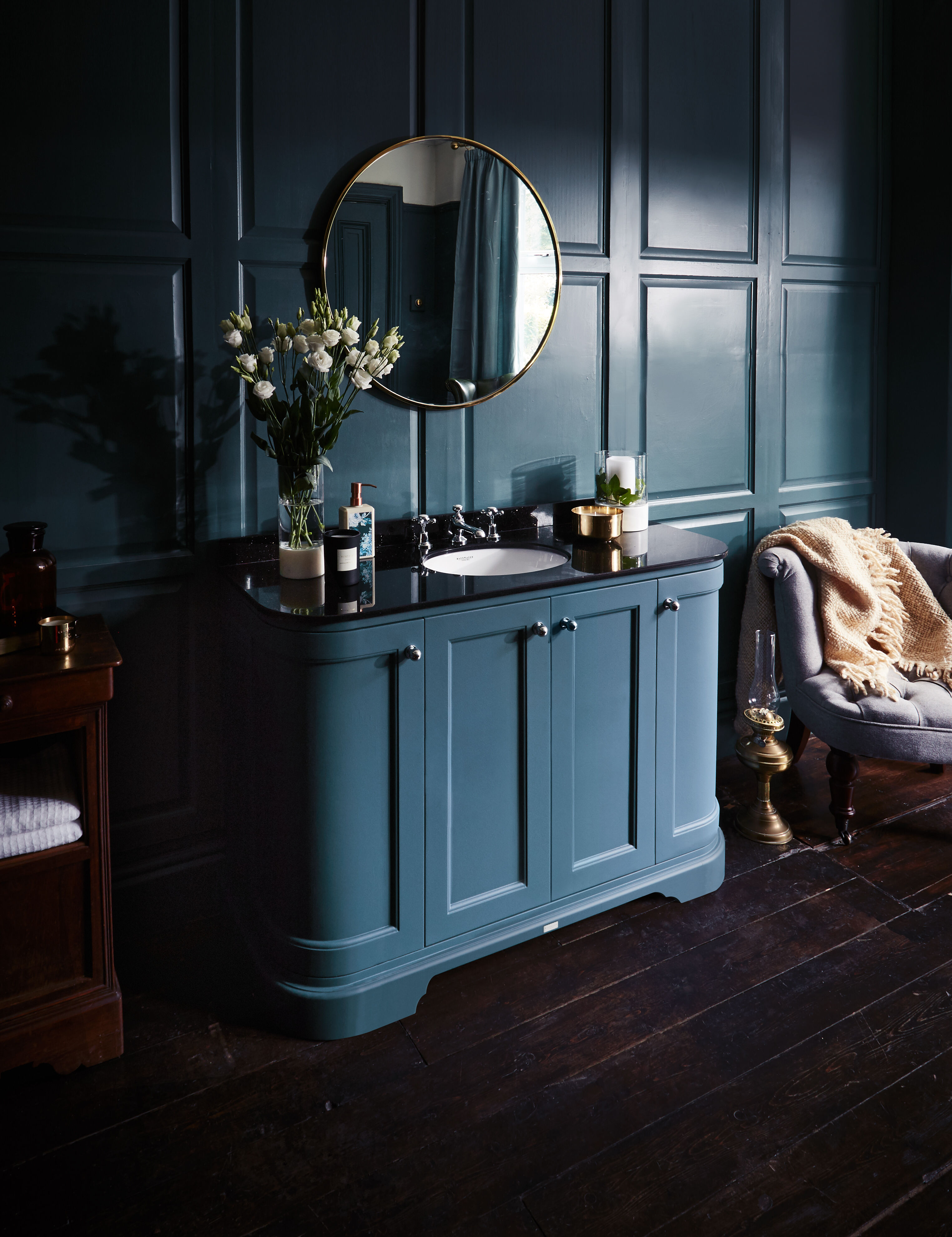 This unique blue cabinet creates a striking centre piece to any classic themed bathroom.