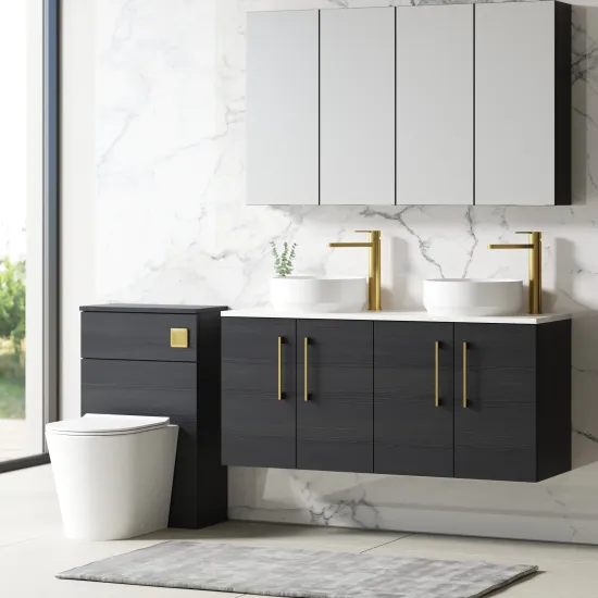 nuie 1200mm Wall Hung 4-Door Vanity & Laminate Worktop - Charcoal Black Woodgrain