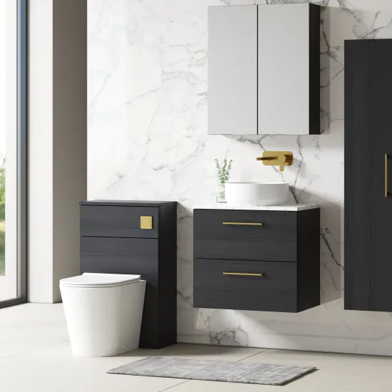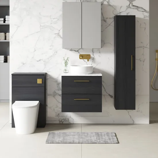 nuie 600mm Wall Hung 2-Drawer Vanity & Laminate Worktop - Charcoal Black Woodgrain