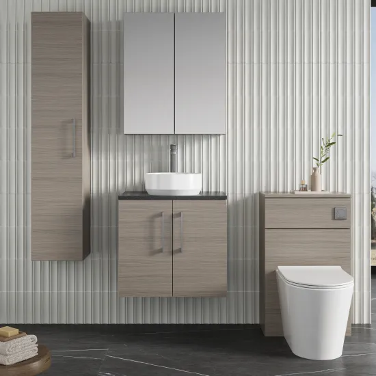 This unique solace oak finish compliments any modern bathroom and creates a designer look