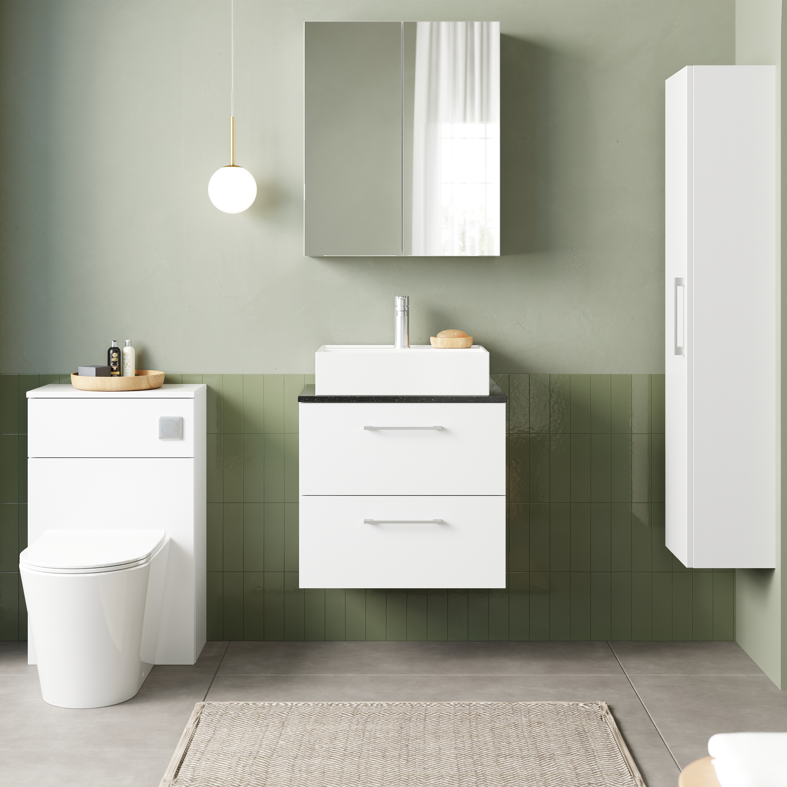 This gloss white finish compliments any modern bathroom and creates a designer look