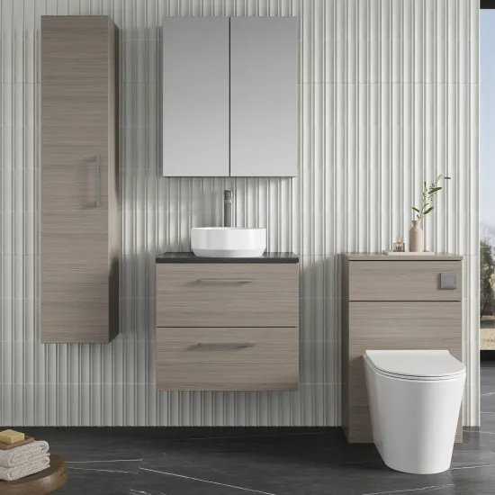 This unique solace oak finish compliments any modern bathroom and creates a designer look