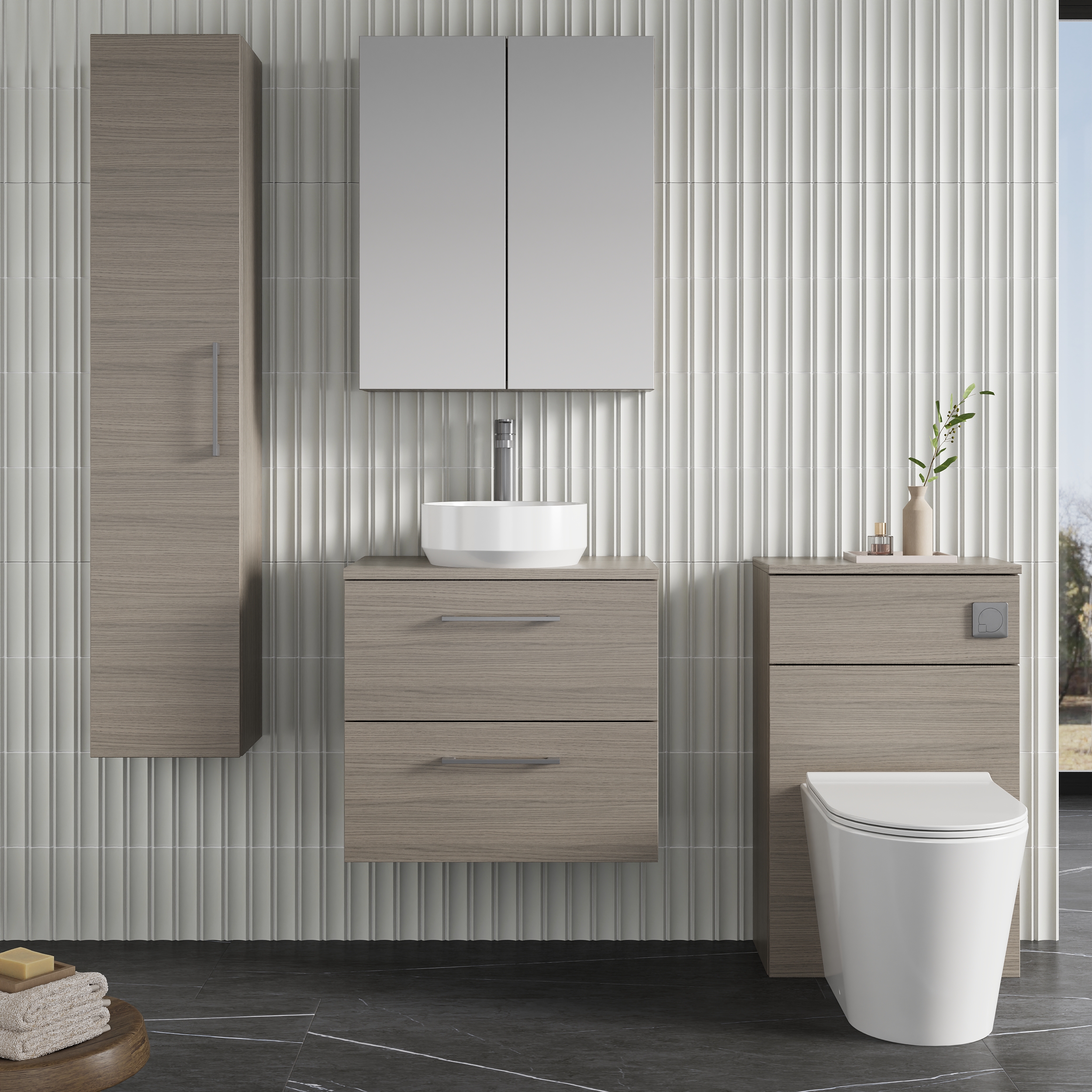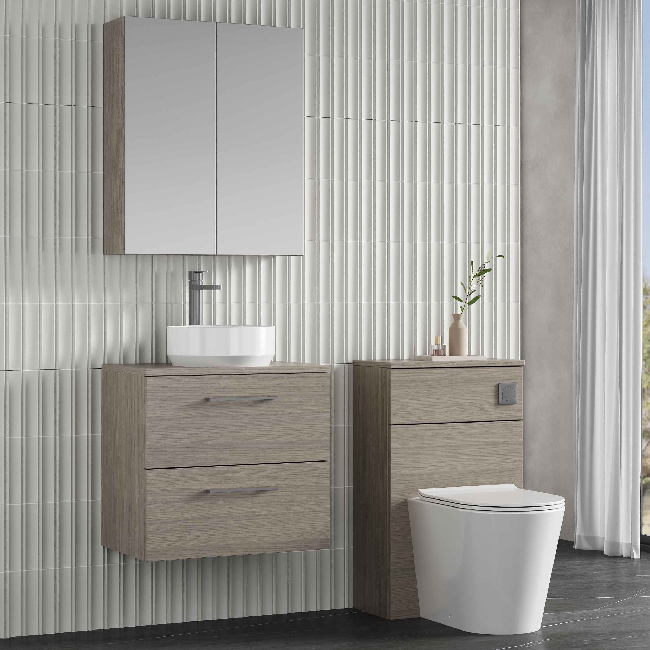 This unique solace oak finish compliments any modern bathroom and creates a designer look