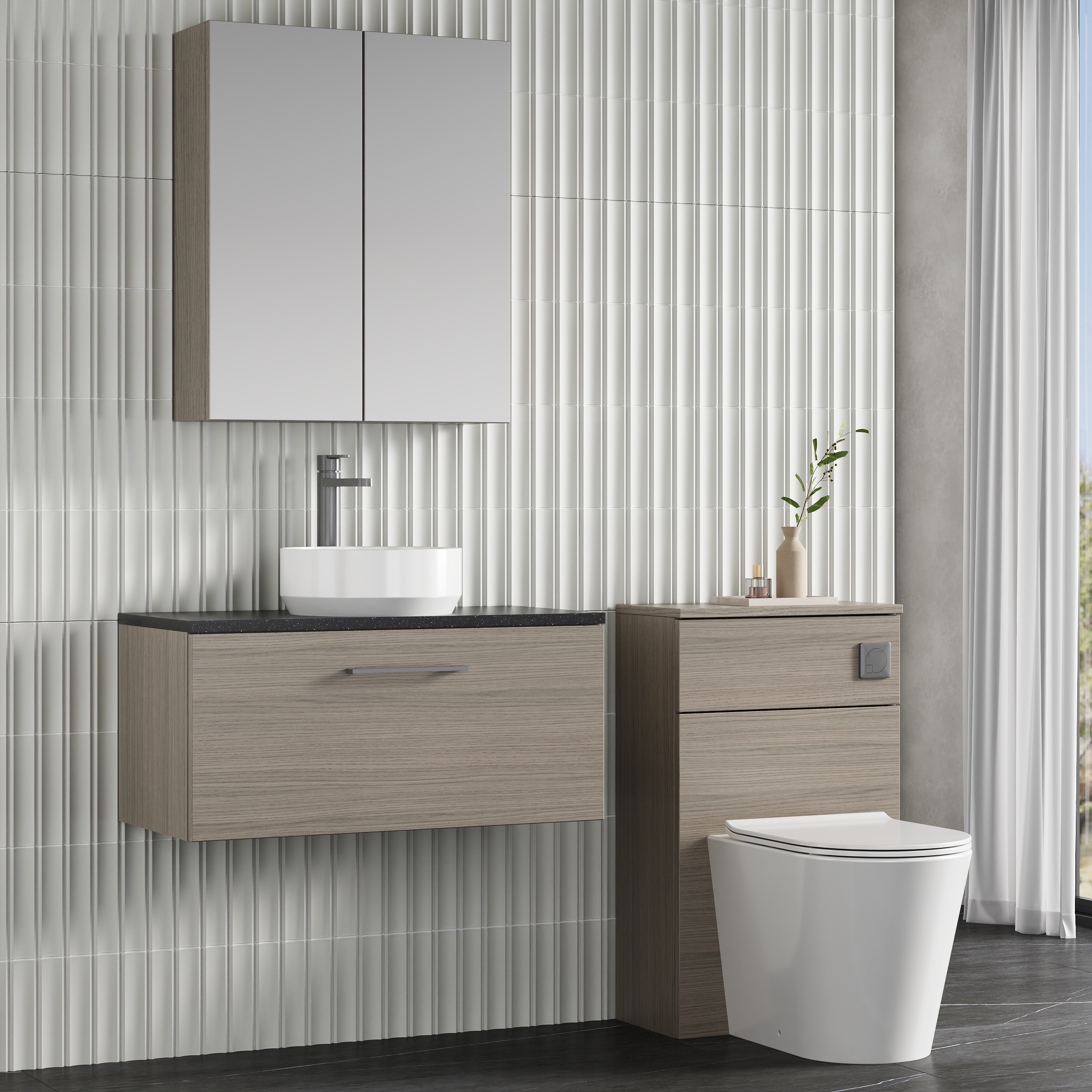 This unique solace oak finish compliments any modern bathroom to create a designer look