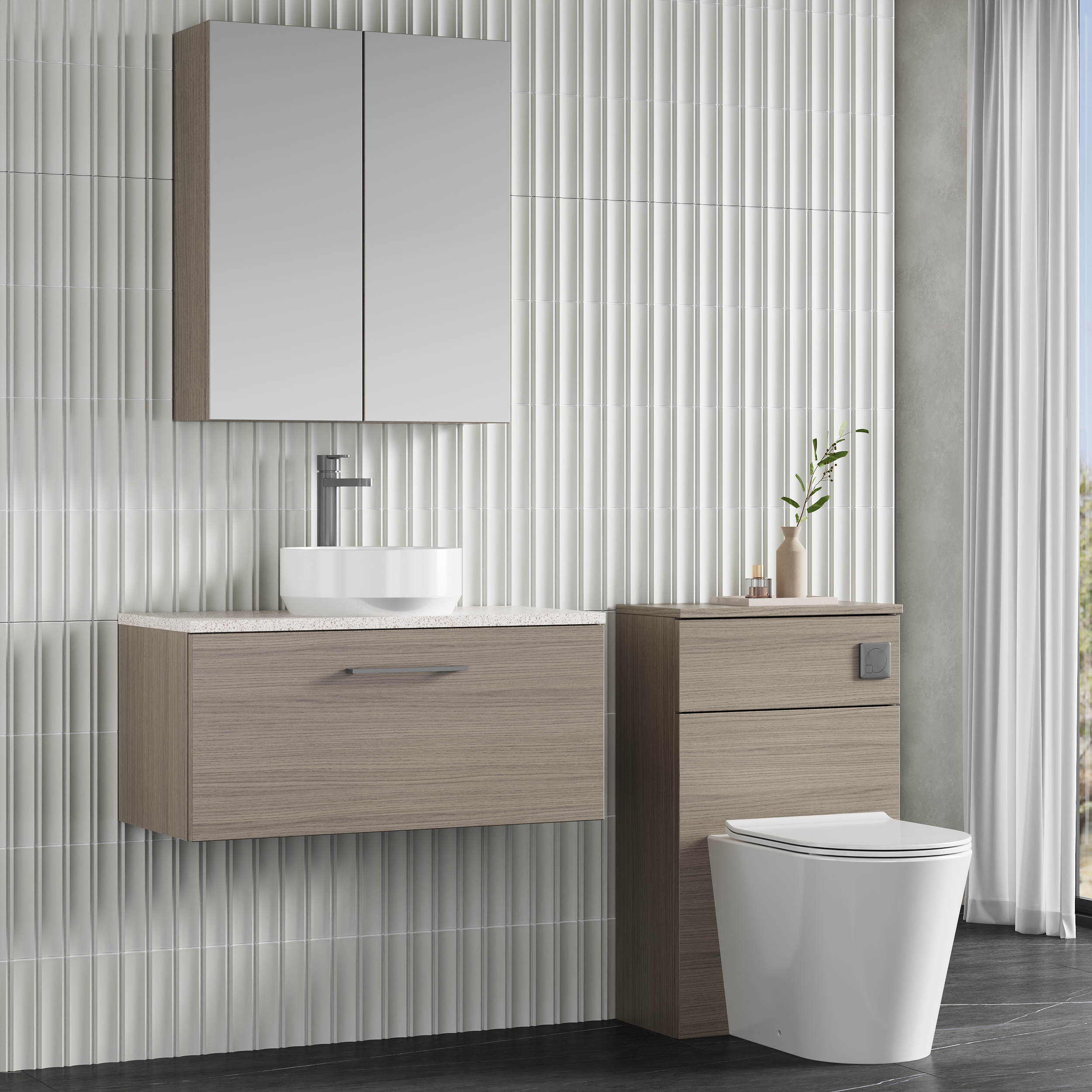 This unique solace oak finish compliments any modern bathroom to create a designer look