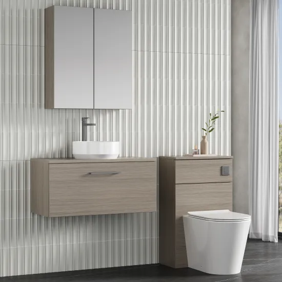 This unique solace oak finish compliments any modern bathroom and creates a designer look