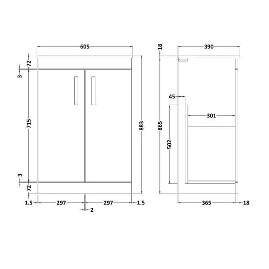 Nuie Athena 600mm Floor Standing 2 Drawer Vanity Unit With Worktop & Handles