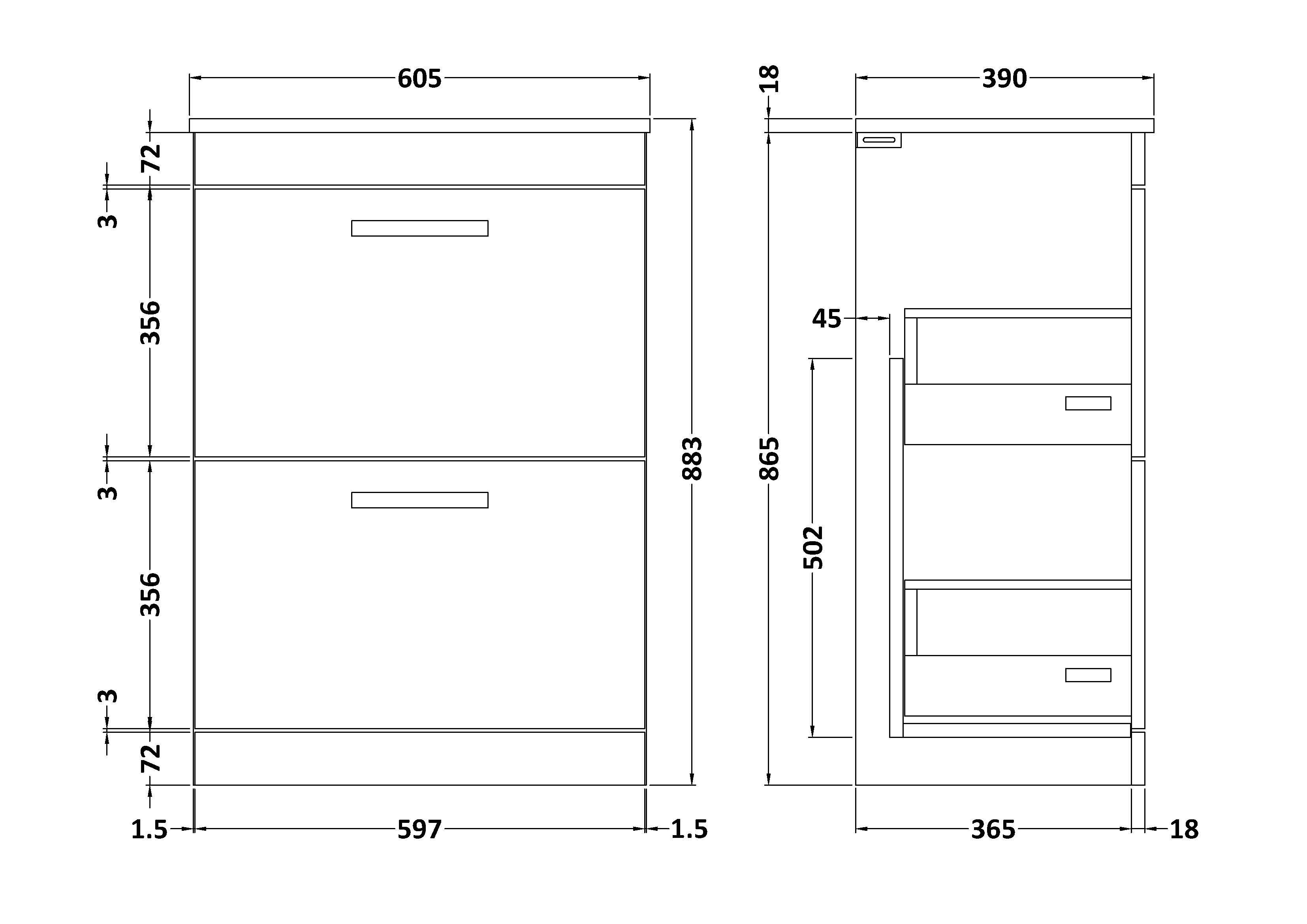 Nuie Athena 600mm Floor Standing 2 Drawer Vanity Unit With Worktop & Soft Close Drawers