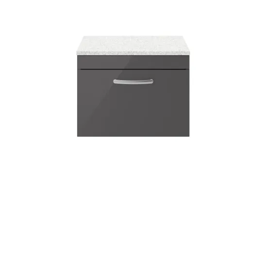 Nuie Athena 600mm Gloss Grey Wall Hung Single Drawer Vanity Unit With Sparkling White Worktop With Soft Close Drawer