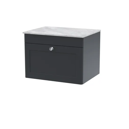 Nuie Classique 600mm Soft Black Wall Hung 1-Drawer Vanity Unit With Marble Top & Handle