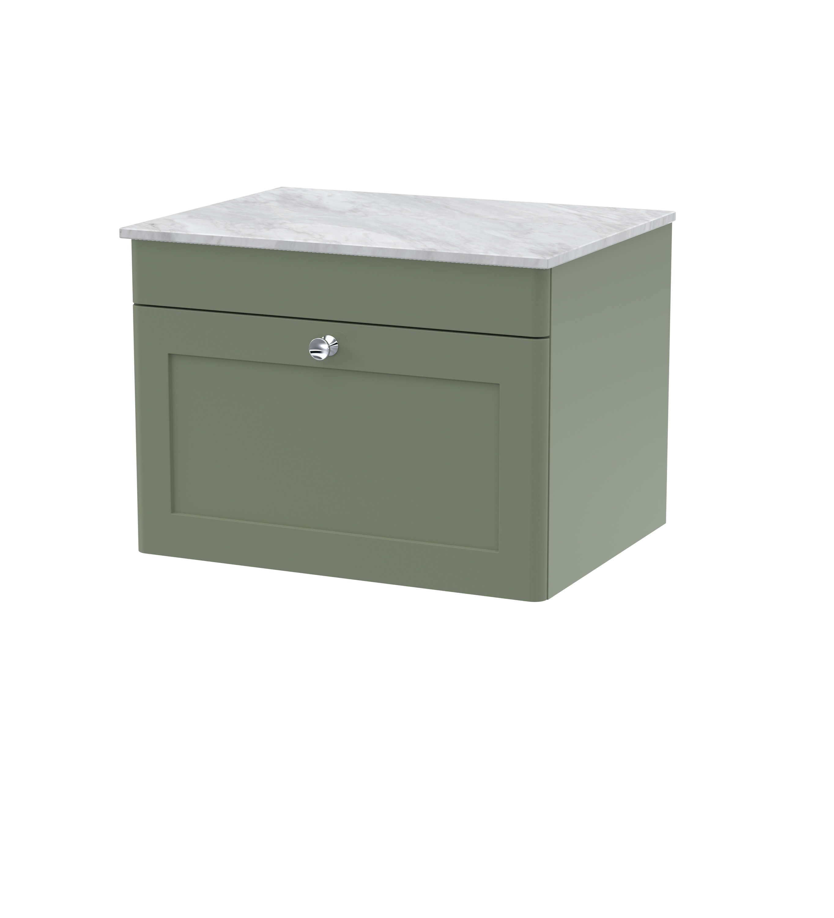 Nuie Classique 600mm Satin Green Wall Hung 1-Drawer Vanity Unit with Marble Top & Soft Close Drawer