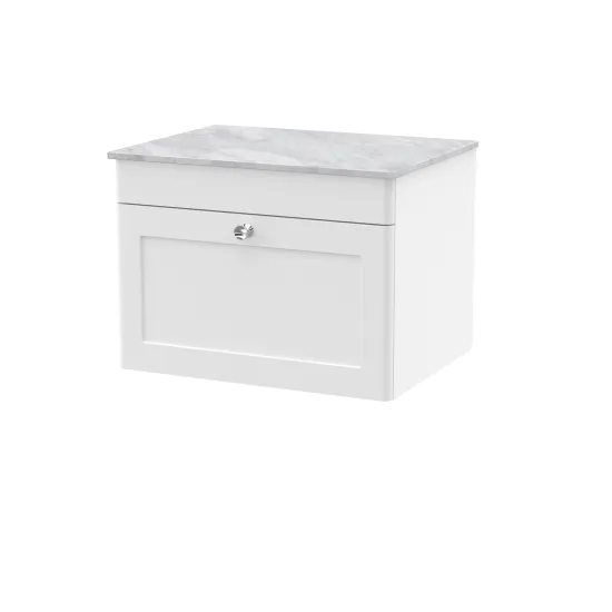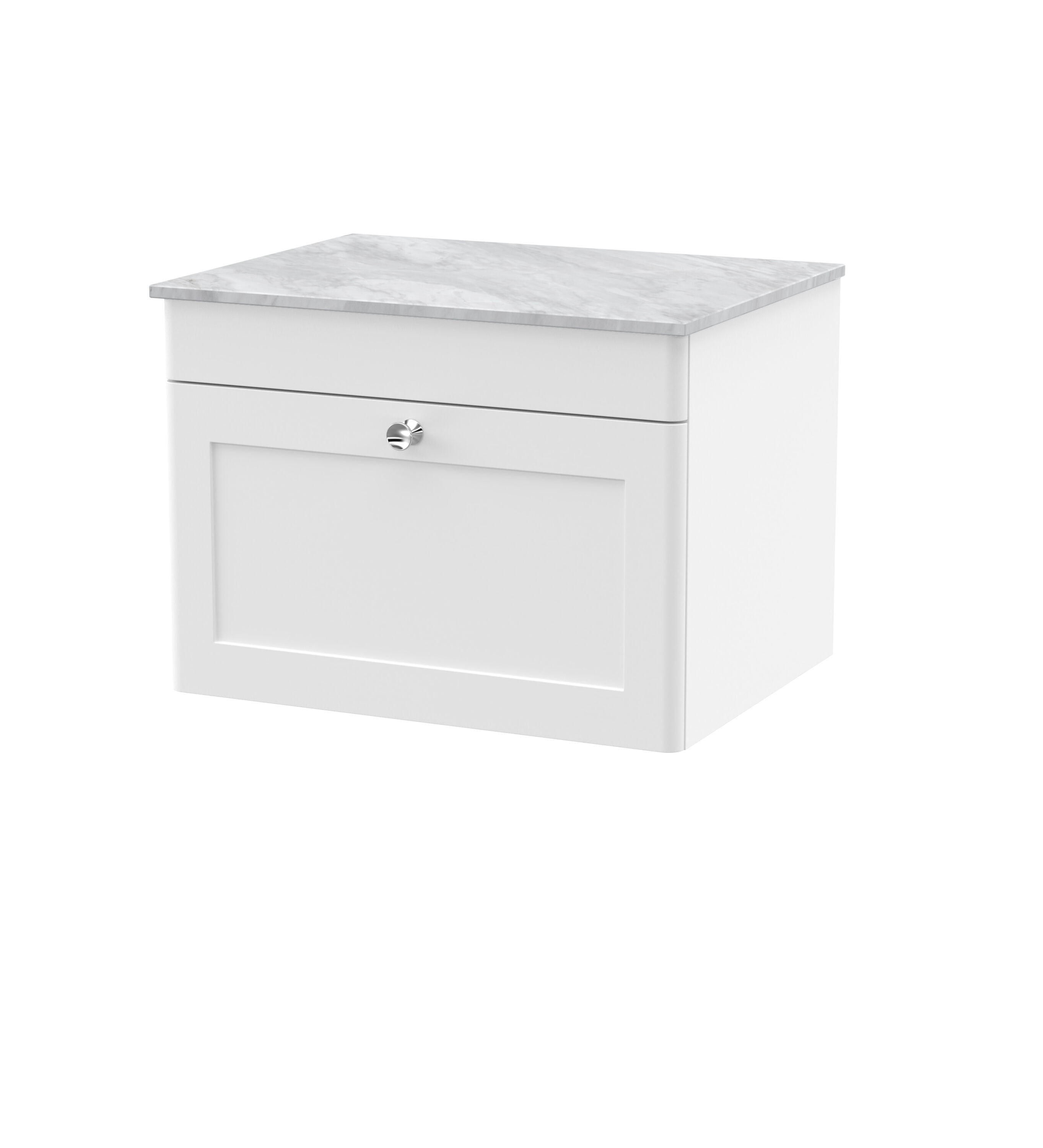 Nuie Classique 600mm Wall Hung Satin White 1-Drawer Vanity Unit With Marble Top