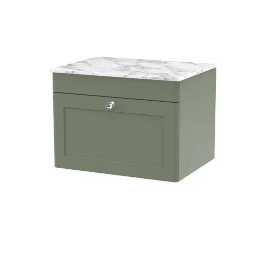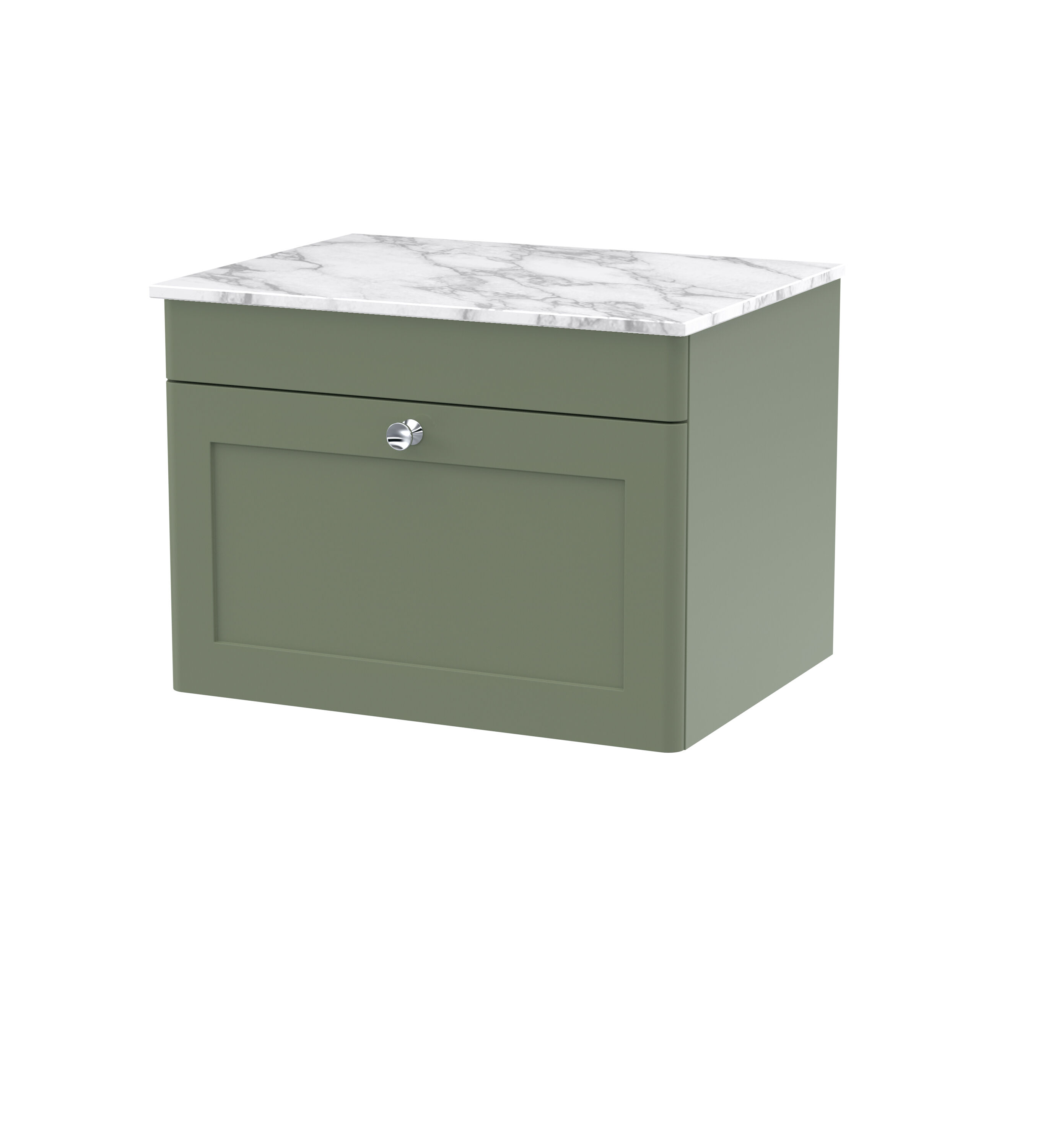 Nuie Classique 600mm Wall Hung Satin Green 1-Drawer Vanity Unit with Marble Top With Chrome Handle