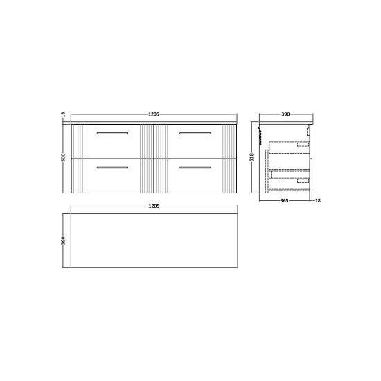 nuie Deco 1200mm Wall Hung 4-Drawer Vanity & Worktop - Soft Black