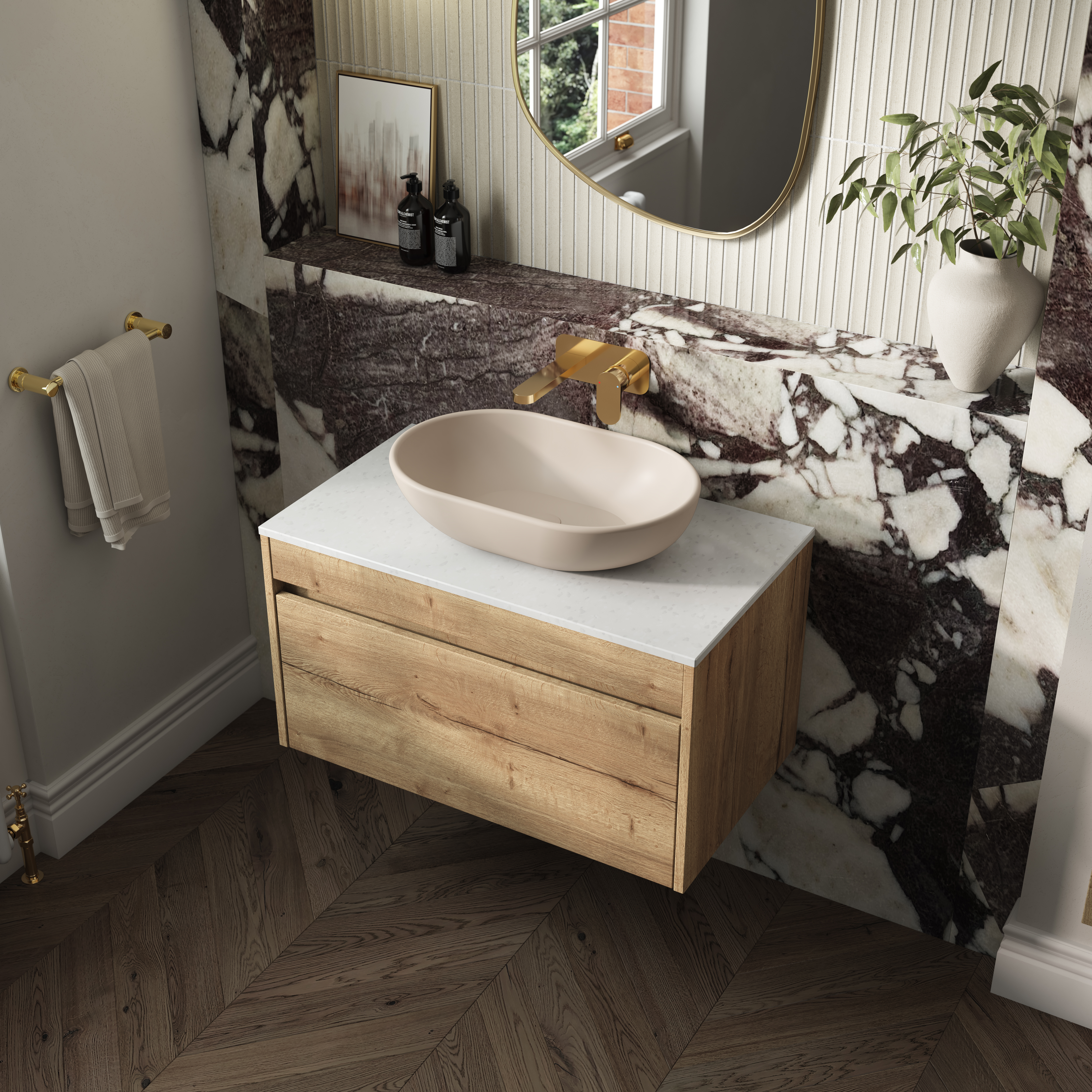 BC Designs Loftwood 800mm Wall Hung 1 Drawer Unit and Marble Worktop - Autumn Oak