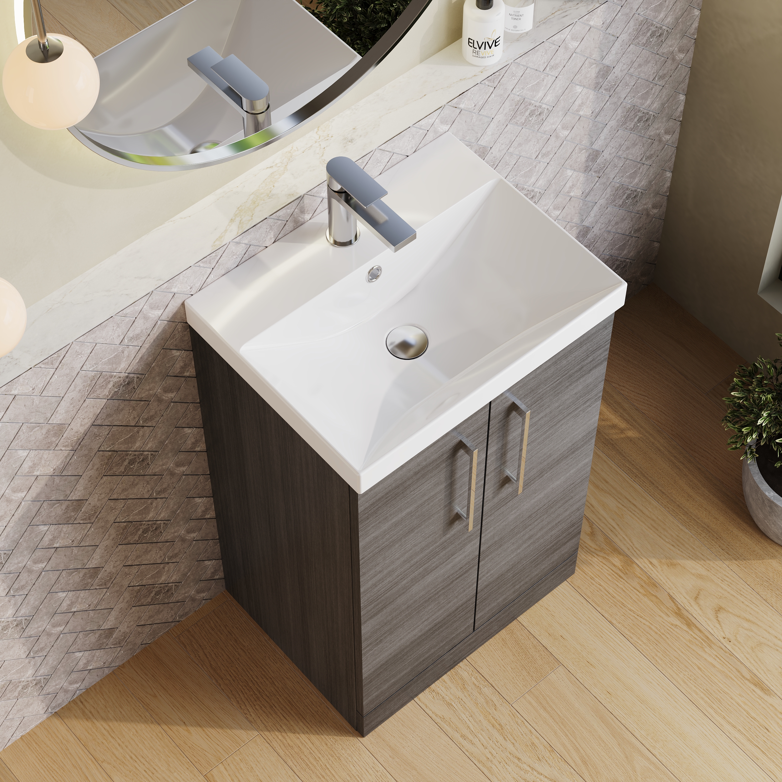 Nuie 500mm Floor Standing Anthracite Woodgrain 2-Door Vanity Unit With Basin