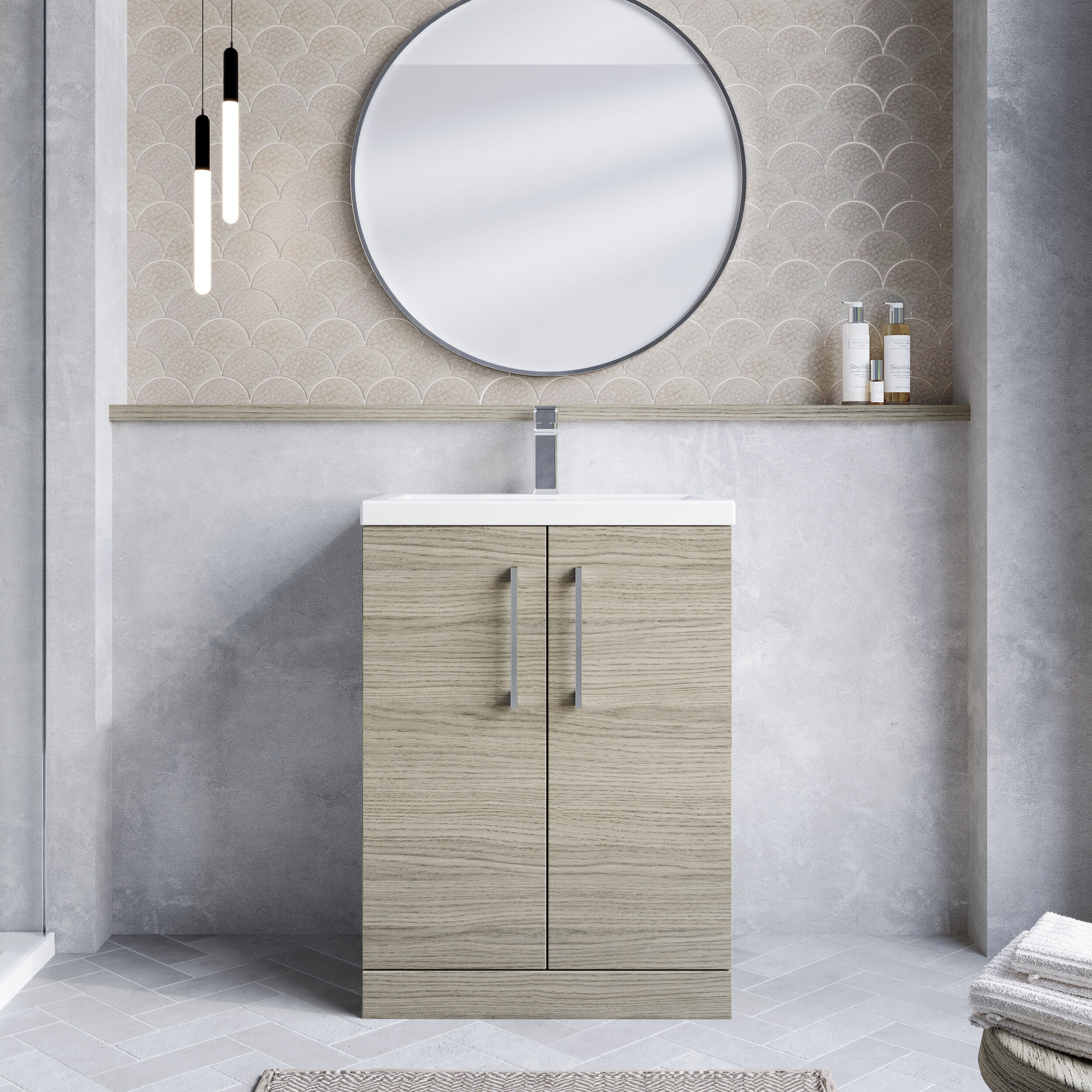 nuie Arno Compact 600mm Floor Standing 2-Door Vanity & Ceramic Basin - Solace Oak