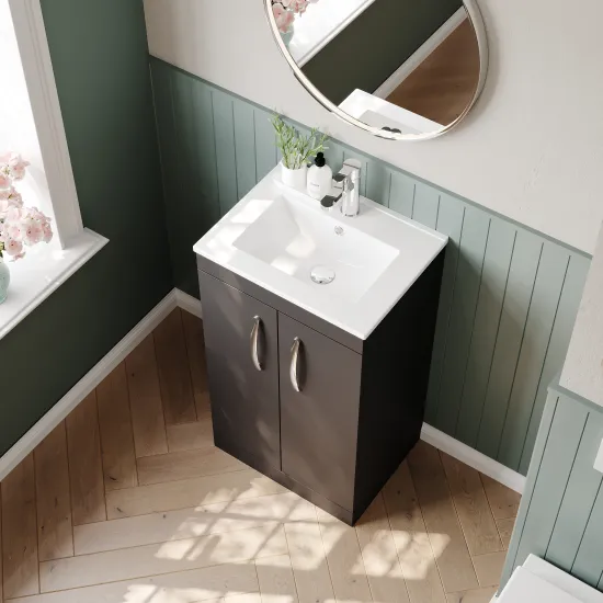 Nuie Athena 600mm Wall Hung 2 Drawer Anthracite Woodgrain Vanity Unit With Grey Worktop