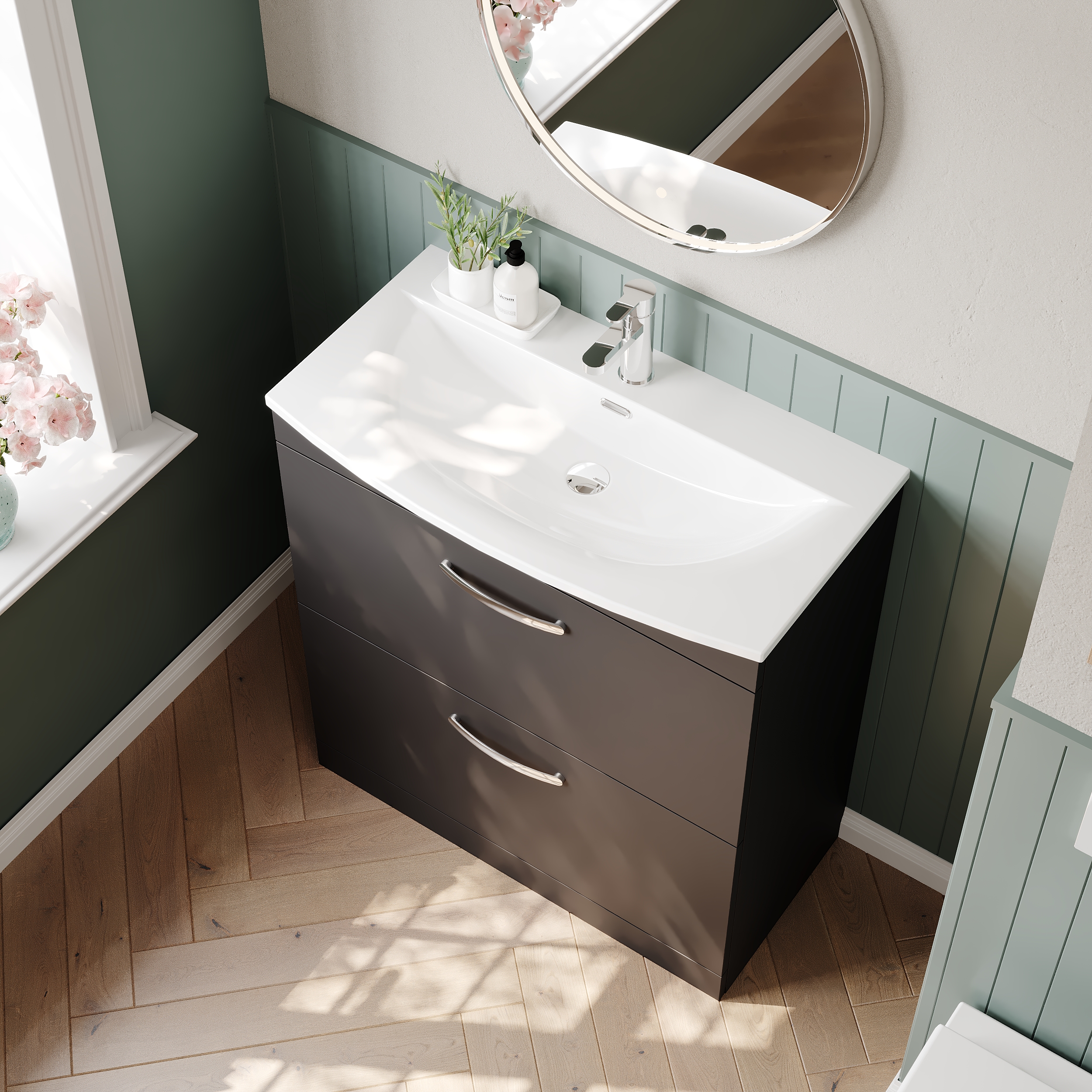 nuie Athena Floor Standing 2 Drawer Vanity With Curved 1 Tap Hole Ceramic Basin 800mm - Gloss Grey