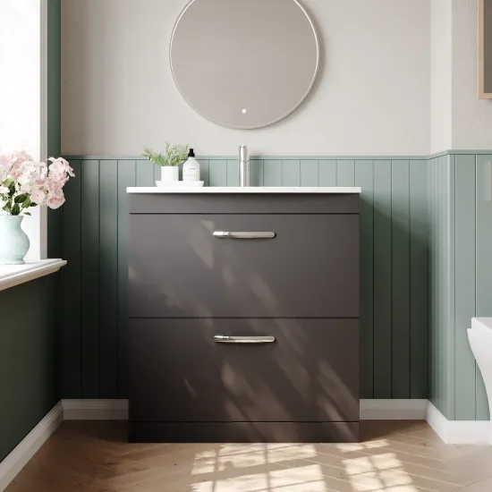 Nuie Athena 800mm Gloss Grey Floor Standing 2 Drawer Soft Close Vanity Unit With 1 Tap Hole Basin