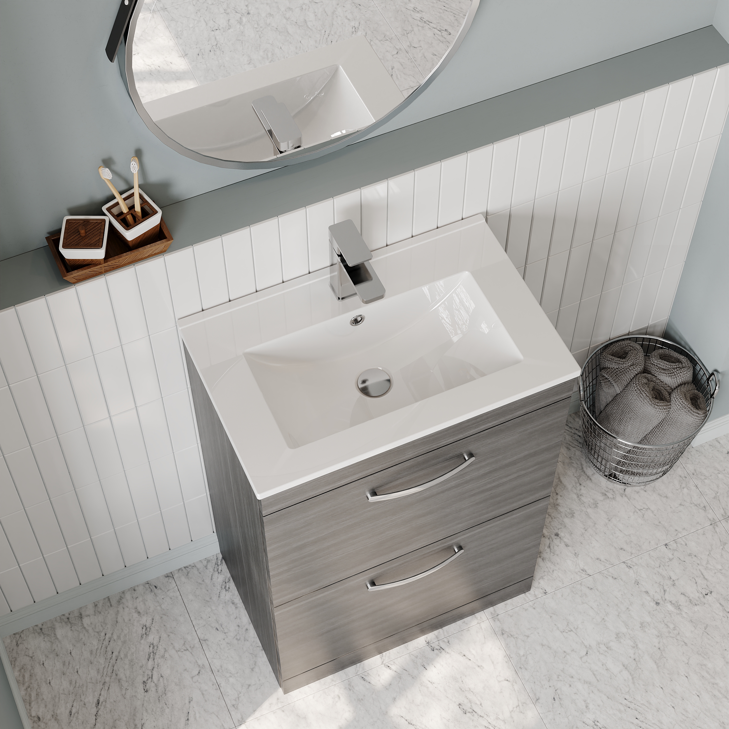 nuie Athena Floor Standing 2 Drawer Vanity With Minimalist 1 Tap Hole Ceramic Basin 600mm - Anthracite Woodgrain