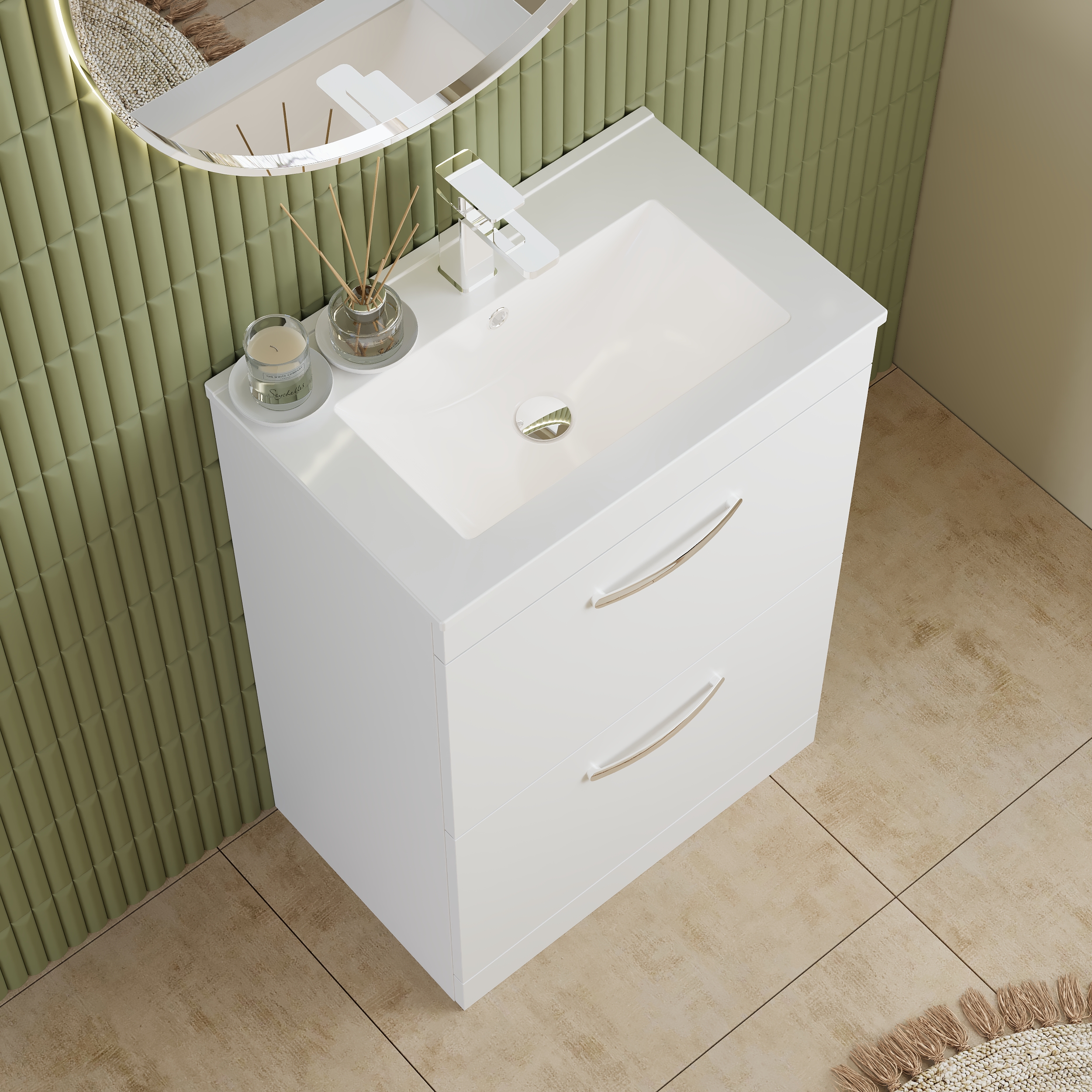 nuie Athena Floor Standing 2 Drawer Vanity With Minimalist 1 Tap Hole Ceramic Basin 600mm - Gloss White
