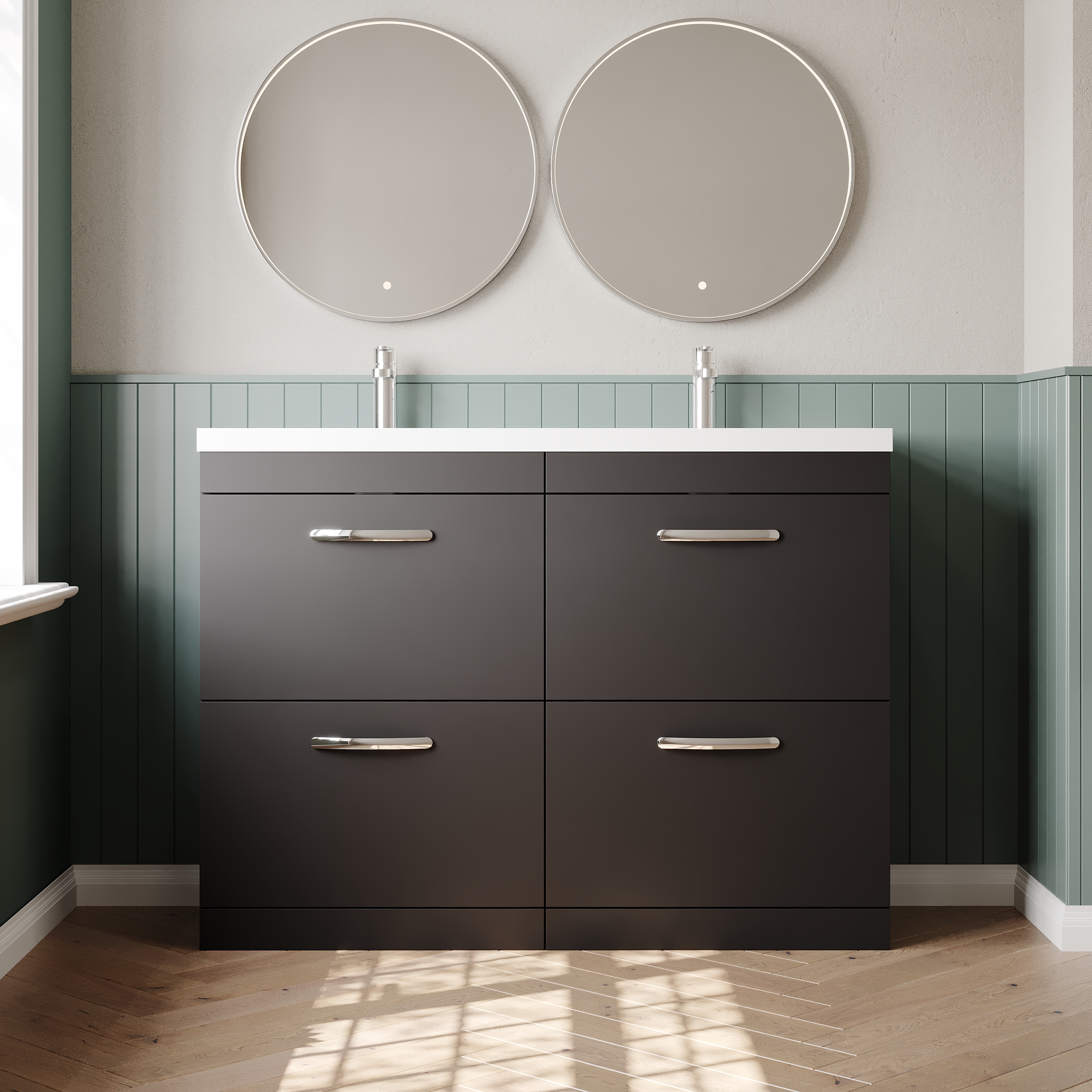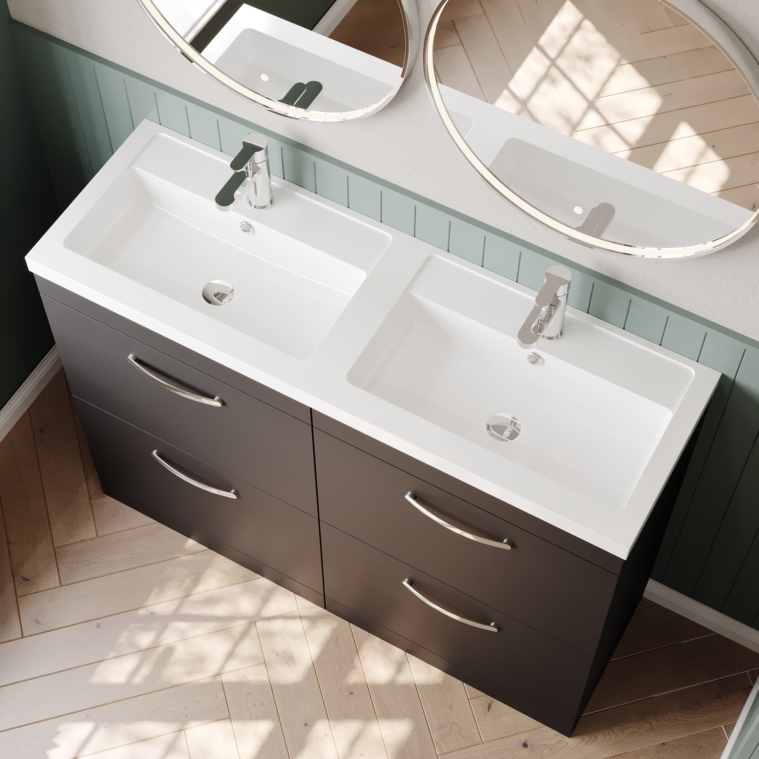 Nuie Athena 1200mm Anthracite Woodgrain Floor Standing 4 Drawer Vanity Unit With Twin Polymarble Basin