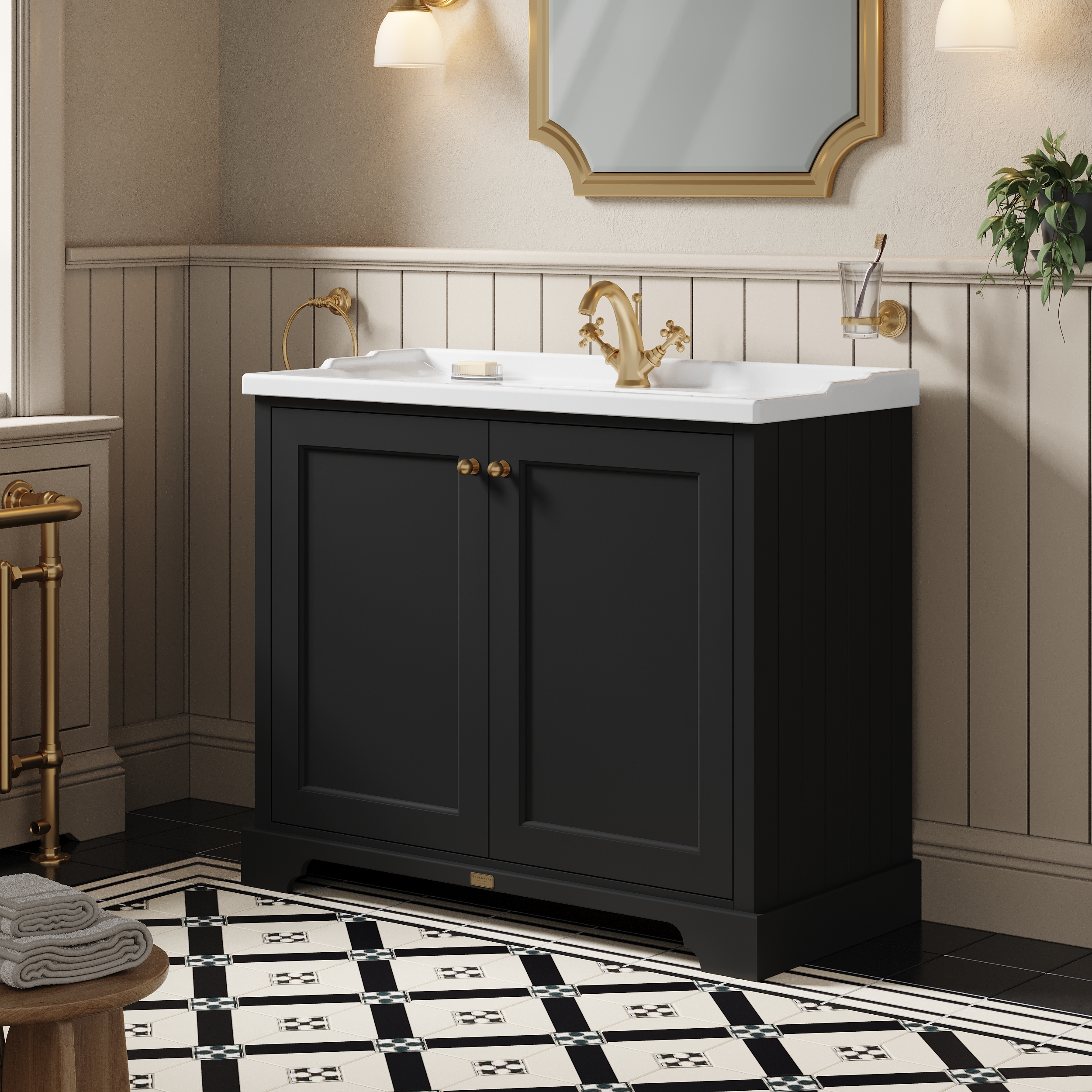 This striking black cabinet creates a unique centre piece to any classic themed bathroom
