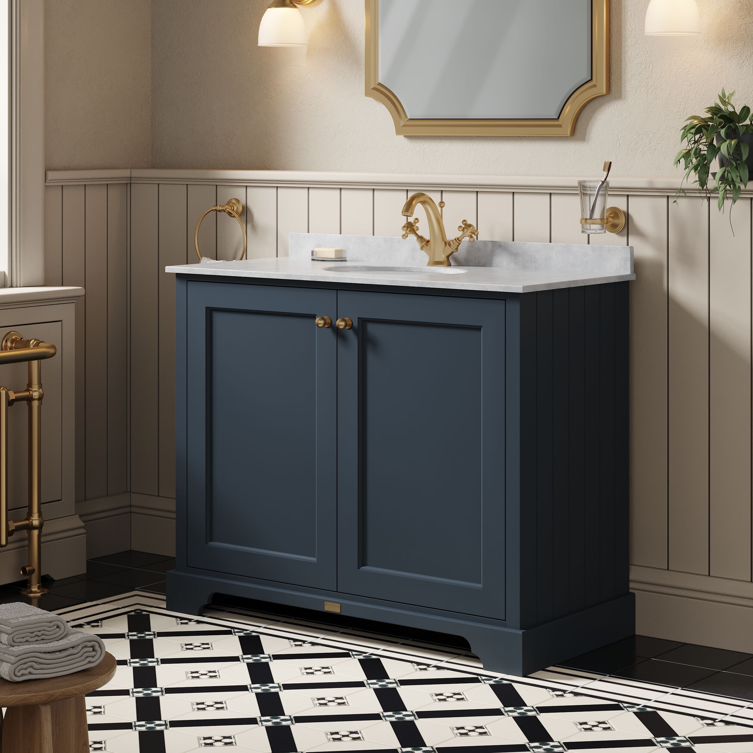 This striking blue cabinet creates a unique centre piece to any classic themed bathroom