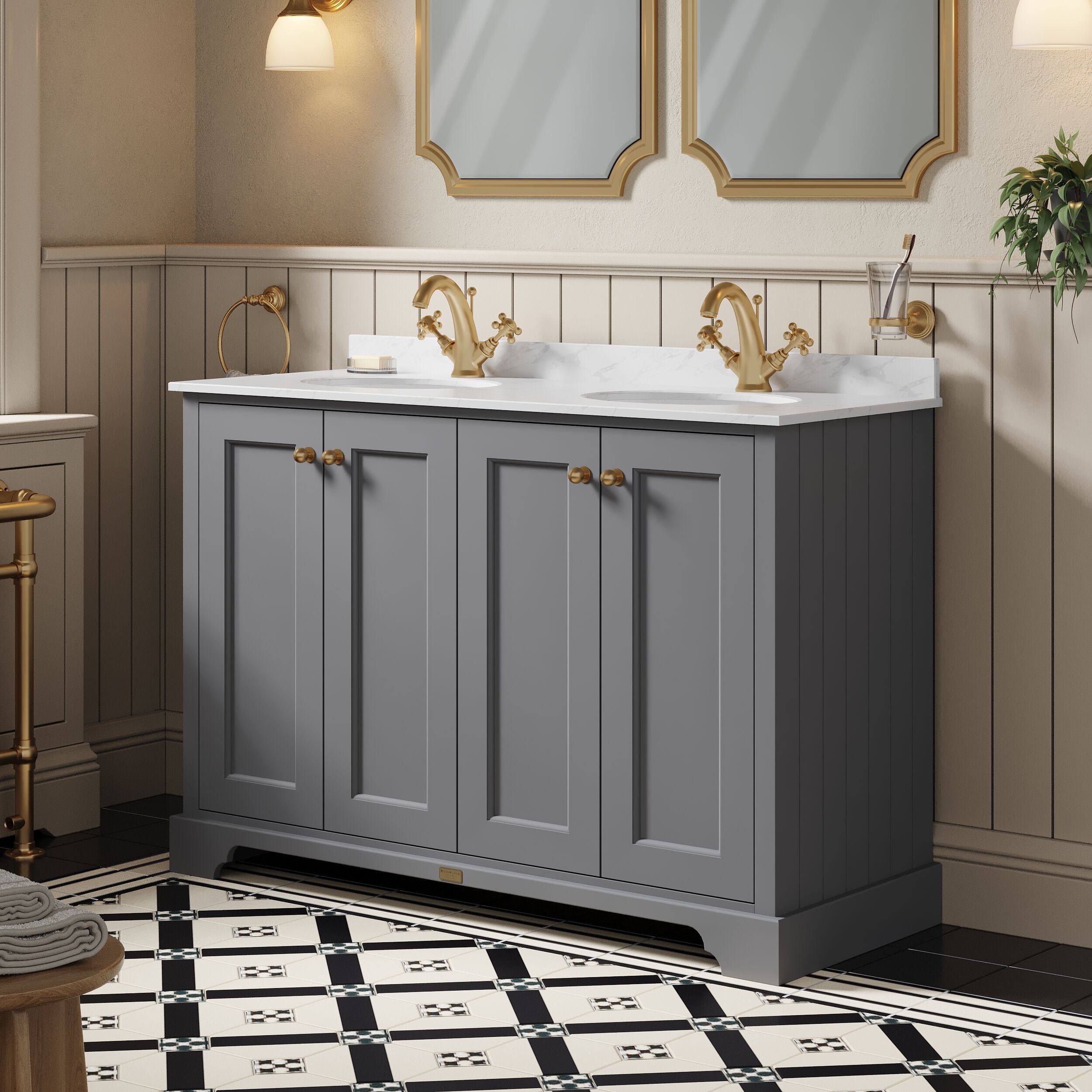 This striking grey cabinet creates a unique centre piece to any classic themed bathroom