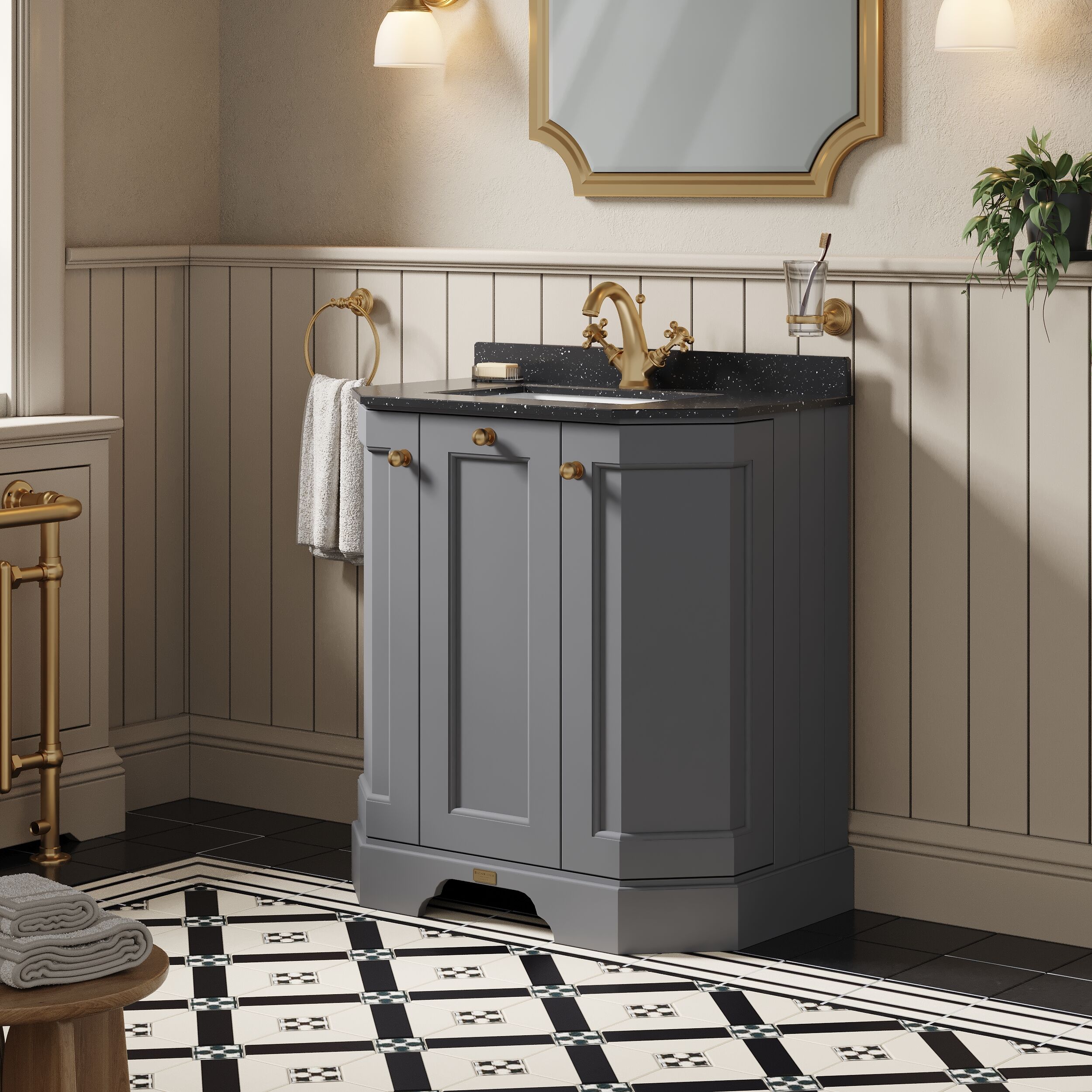 This striking grey cabinet creates a unique centre piece to any classic themed bathroom