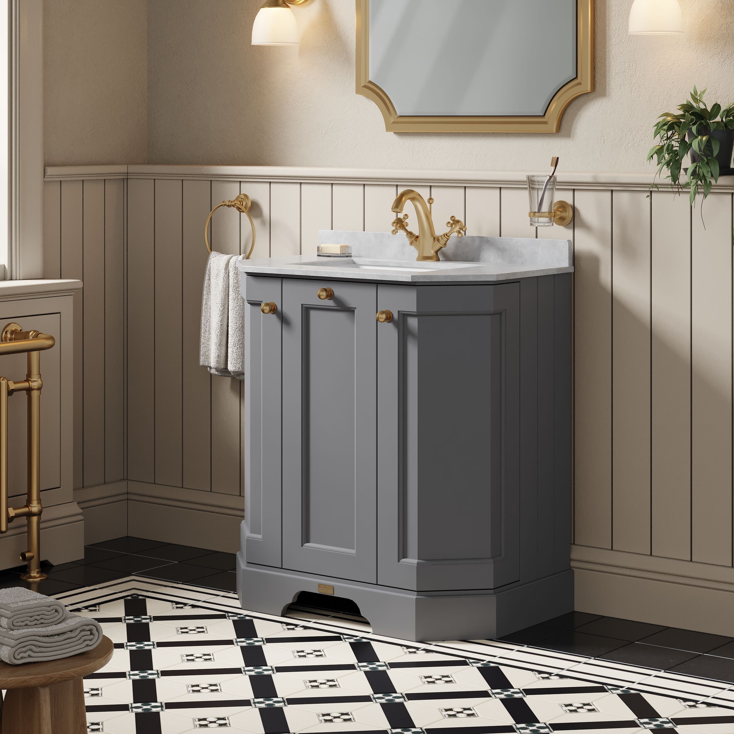This striking grey cabinet creates a unique centre piece to any classic themed bathroom