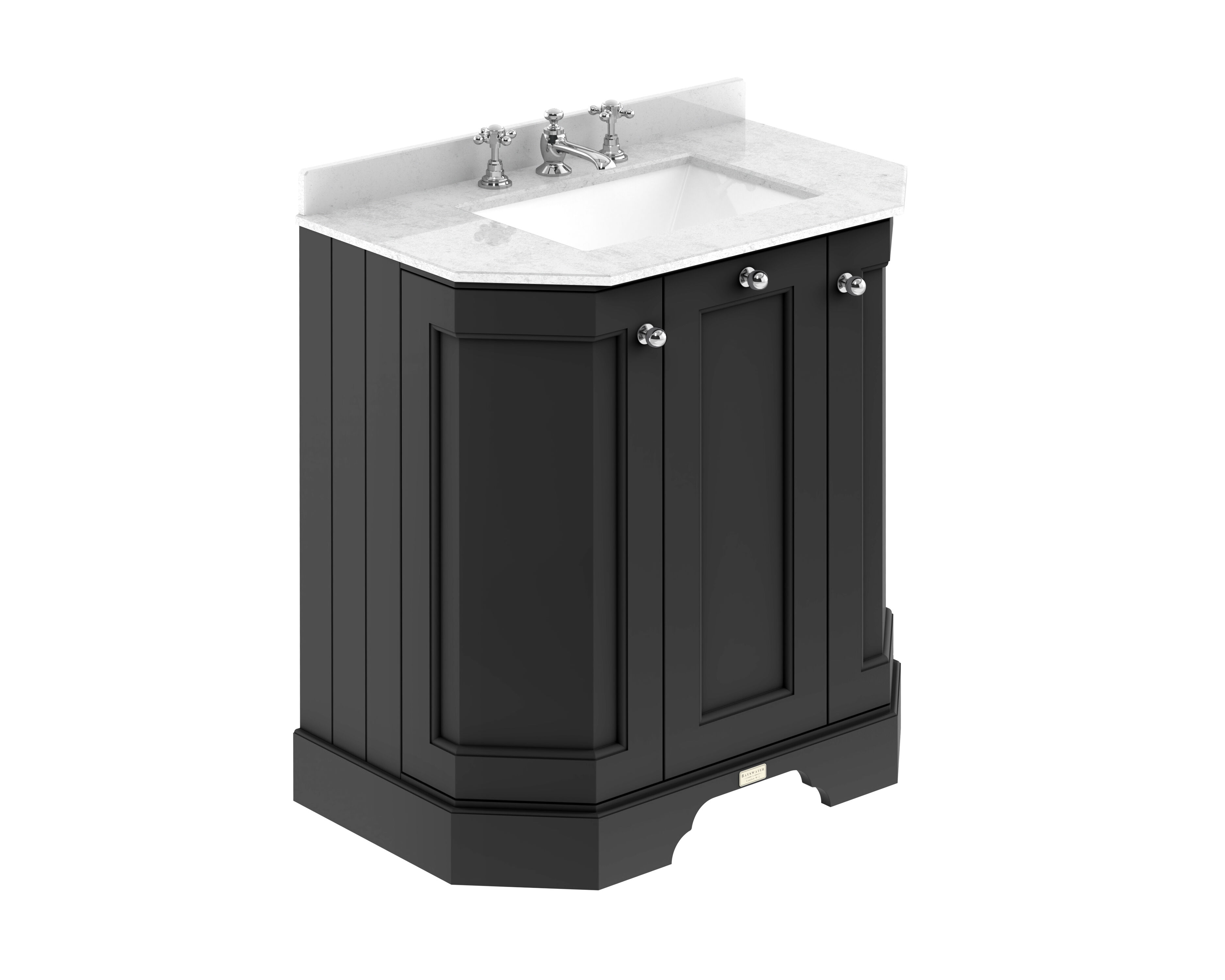Bayswater 750mm 3-Door Angled Cab With 3 Tap Hole White Marble Top Basin - Matt Black