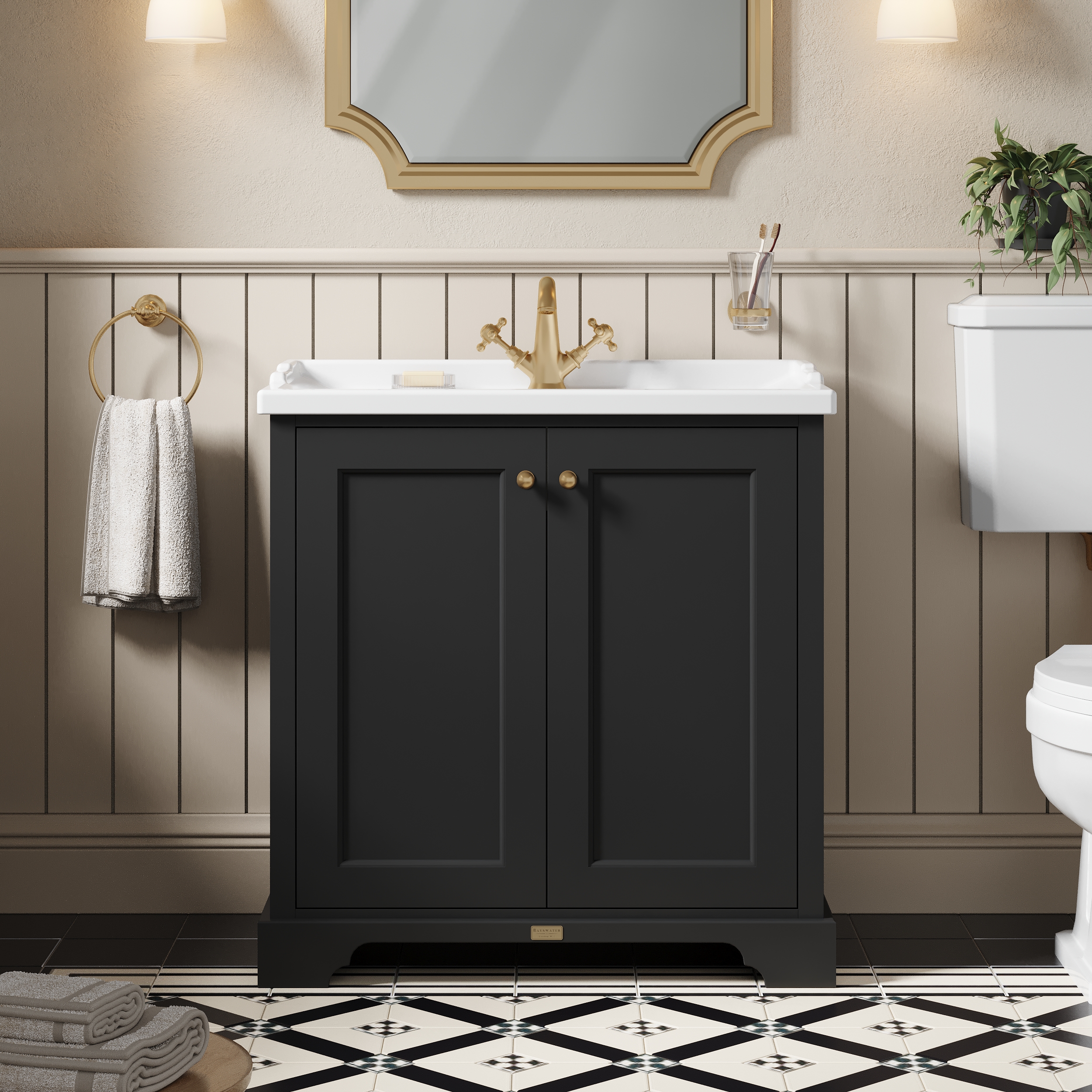 This striking black cabinet creates a unique centre piece to any classic themed bathroom
