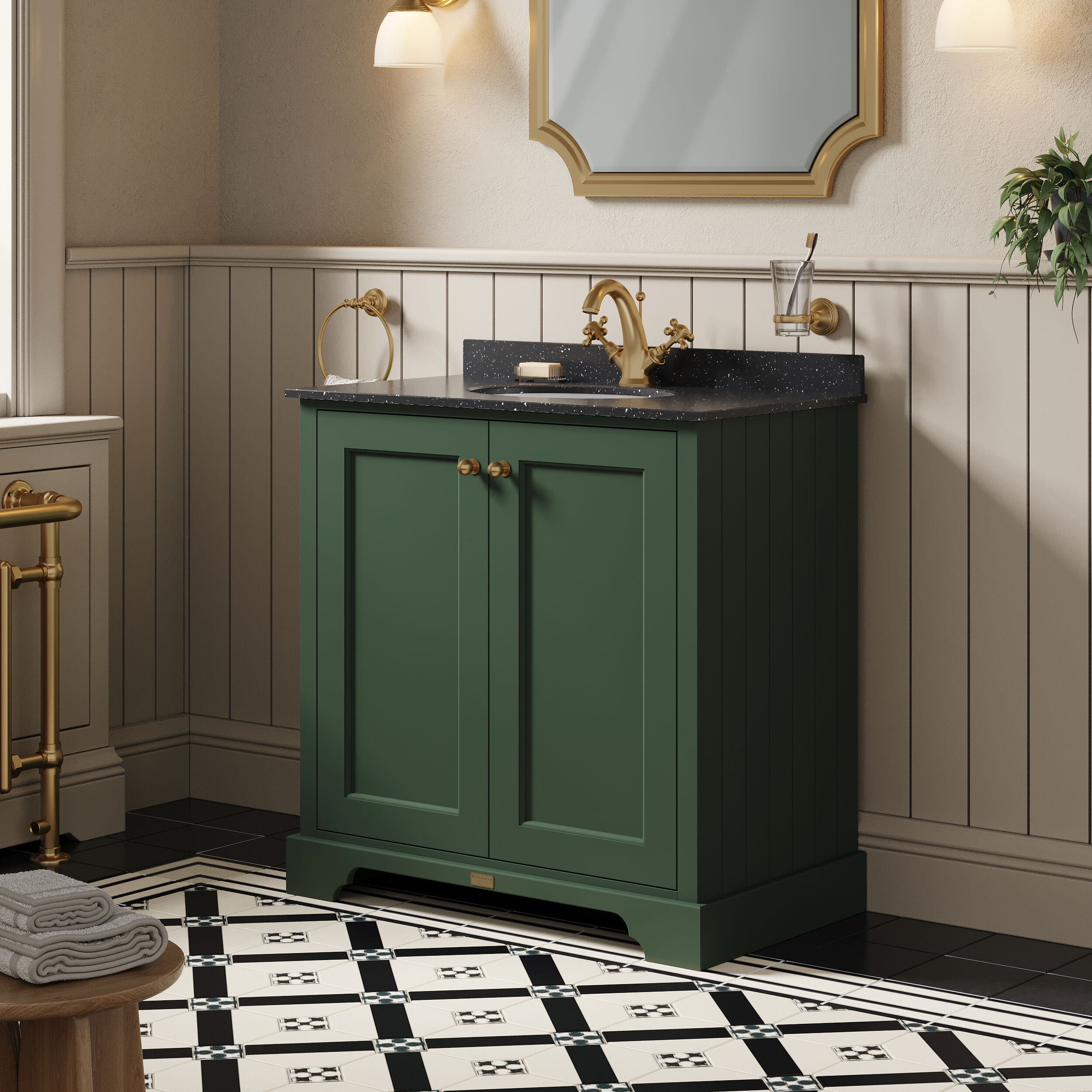 This striking green cabinet creates a unique centre piece to any classic themed bathroom